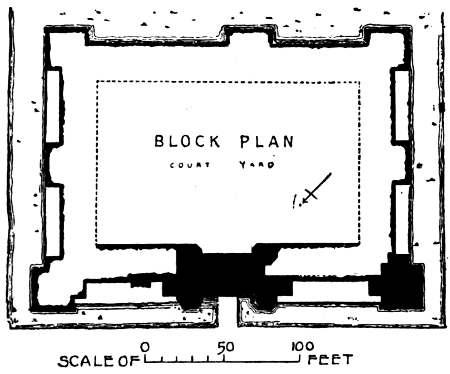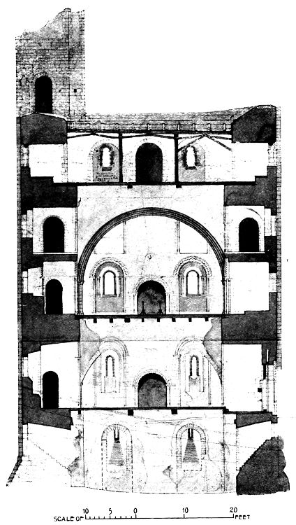 The keeps were massive rectangular structures several storeys in height, with walls of great thickness. Their size varied according to the requirements of the owner. Some were about 90 ft. square, others but 30 or 40 ft. They were not necessarily exactly square,[5] but, as a rule, their sides were of nearly equal length. The White Tower of the Tower of London, begun by order of the Conqueror in the later years of the eleventh century, measures 118 by 107 ft. The keep of Rochester Castle, built about 1130, is 70 ft. square. Castle Hedingham in Essex, built about the same time, is 60 by 55 ft.; the keep of Dover Castle (about 1154) is 90 ft. square; Castle Rising (Fig. 1), probably a few years later in date, is 75 by 60 ft.; Kenilworth, dating from the third quarter of the century, is 87 by 54 ft.; while the Peak Castle in Derbyshire, erected about 1176, measures some 40 by 36 ft. These are all outside measurements, and as the walls were very thick, seldom less than 8 ft., and sometimes as much as 16 or 20 ft., the available space within them was much less than their total area. Nevertheless, after deducting the thickness of the walls, there remained in the largest such huge rooms as that in the[6] Tower of London, 90 ft. long by 37 ft. wide; in the medium-sized, such as Hedingham, rooms 38 by 31 ft.; while in the smallest, such as the Peak Castle, the space was 22 by 19 ft., equal to the drawing-room of an ordinary house of the present day. But although the rooms were spacious, they were few in number, and badly lighted. As a rule there was but one room on each floor; some of the more important, however, such as Rochester and Castle Rising, had two large rooms on each floor and one or two smaller, but this was the exception rather than the rule. Occasionally a chapel was added; sometimes it occupied part of the floor space inside the walls; sometimes, as at Coningsburgh, it was contrived within the thickness of the wall itself, augmented by hollowing out one of the huge buttresses. But the chapel was always small—space was too valuable for it to be otherwise; and it was used not only for sacred purposes, but also not infrequently as a private room for the lord.