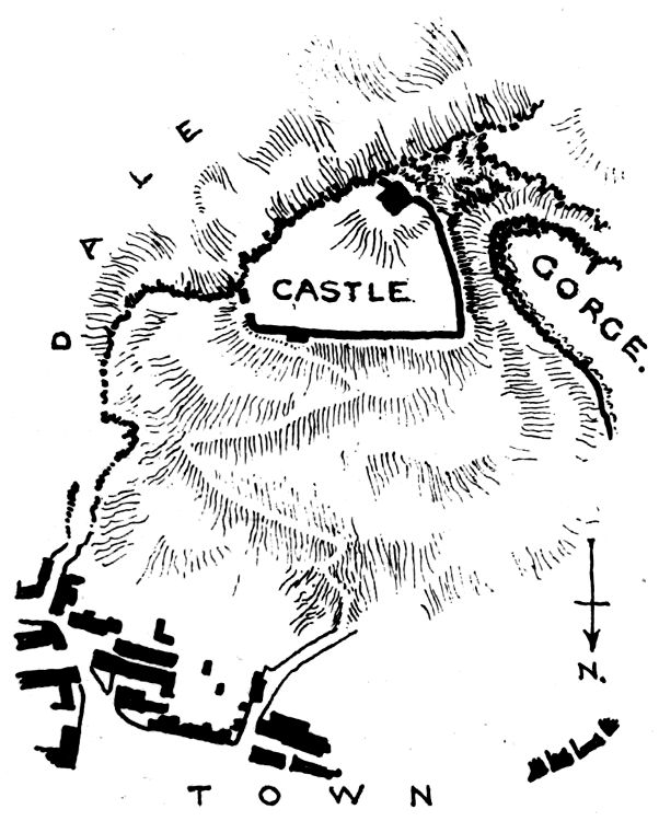 The Peak Castle, at Castleton in Derbyshire (Fig. 10, p. 19), is an extremely interesting example of an early dwelling. Its situation may be described as highly romantic, although that adjective of course expresses a sentiment which is of comparatively modern origin. Up to about the middle of the eighteenth century, travellers regarded such desolate places as Old Sarum, or ruins so difficult of access as the Peak Castle, with feelings approaching to horror. It was only towards the end of[14] that century, or in the early years of the nineteenth, that the romantic aspect was appreciated. It is tolerably certain that romance had no part in the selection of this site for a dwelling, but rather the assurance of security which it offered. An extremely steep spur of the rocky hill which forms one side of a precipitous dale—one of the dales for which Derbyshire is famous—is deeply bitten into by a gorge which almost severs it from its parent ridge (Fig. 7). An irregular triangle of rocky ground is thus formed rising steeply from its longest side up to the opposite angle, and bounded on one side by the precipitous slope of the dale, and on the other by the sheer descent of the gorge. No site could be better protected by nature. The side next the gorge is absolutely inaccessible. The side next the dale offers interesting hazards to good climbers. The remaining side is a grass slope steeper than most modern roofs, and traversed by a zigzag path up which the breathless visitor toils painfully. The town lies at the foot of the slope; the castle, of no great extent, is placed at its[15] summit. The keep is built in the extreme angle, where the gorge desists from finally biting its way through the side of the dale and leaves a narrow rugged strip of rock to connect the almost detached triangle from its parent hillside. A stone flung from one side of the keep would fall sheer down the gorge; flung from the opposite side would drop some 40 or 50 ft. on to the steep slope of the dale, and thence descend with huge and rapid bounds to the bottom.