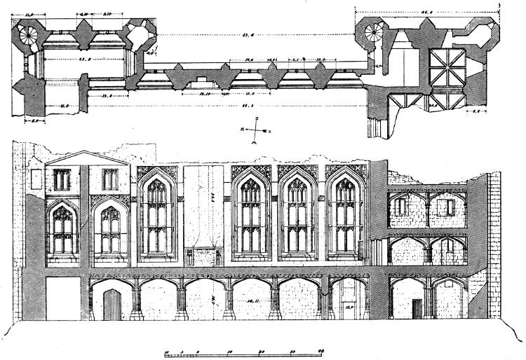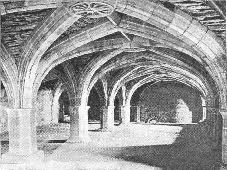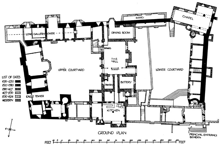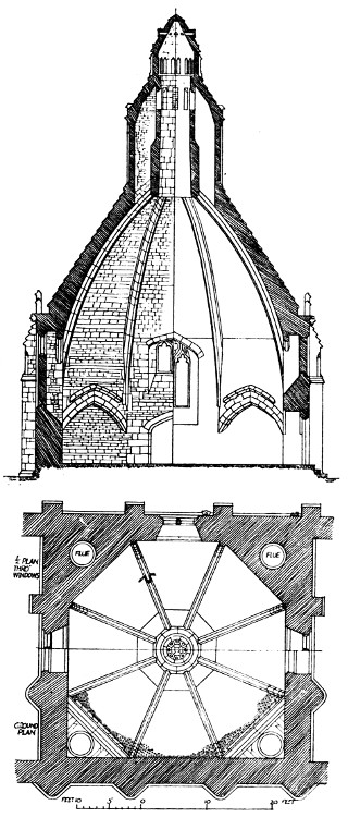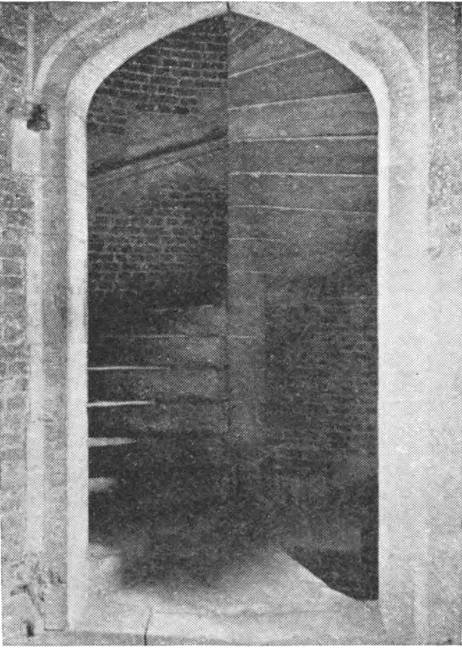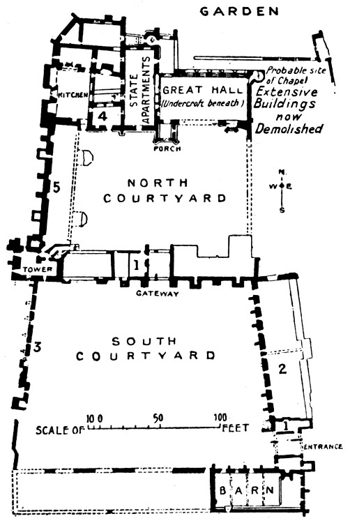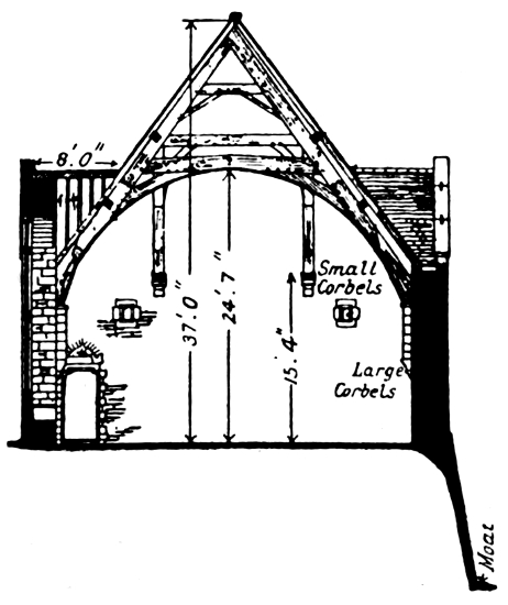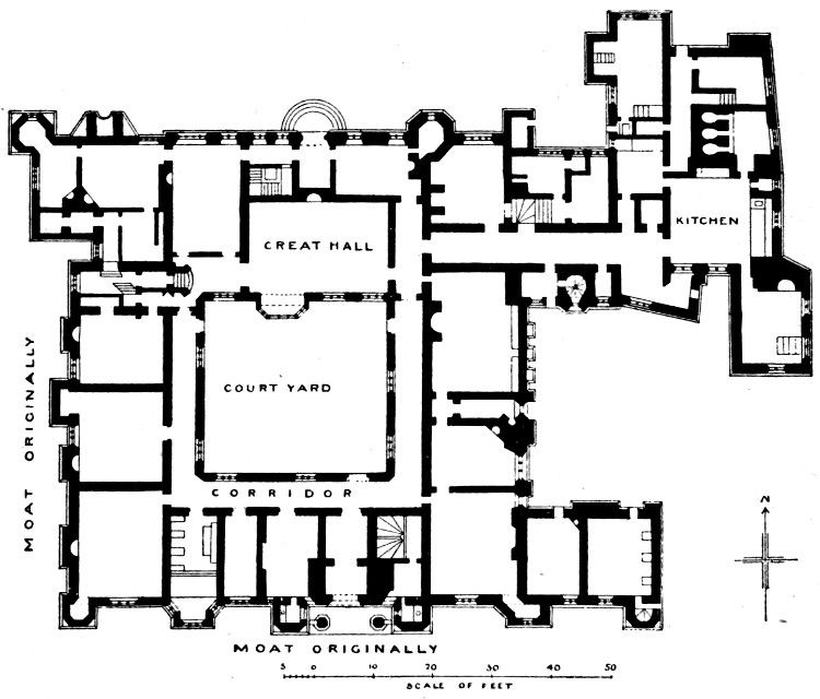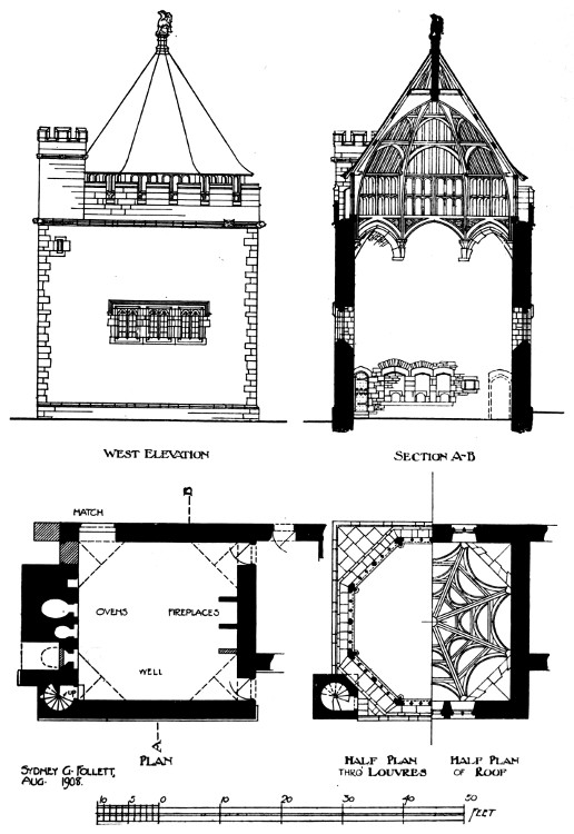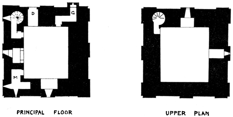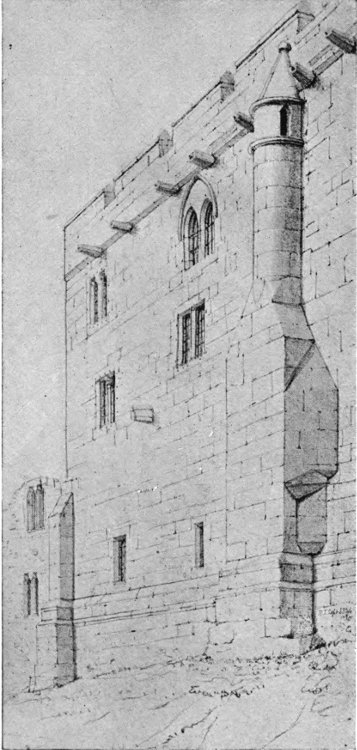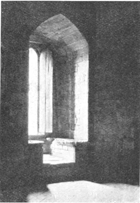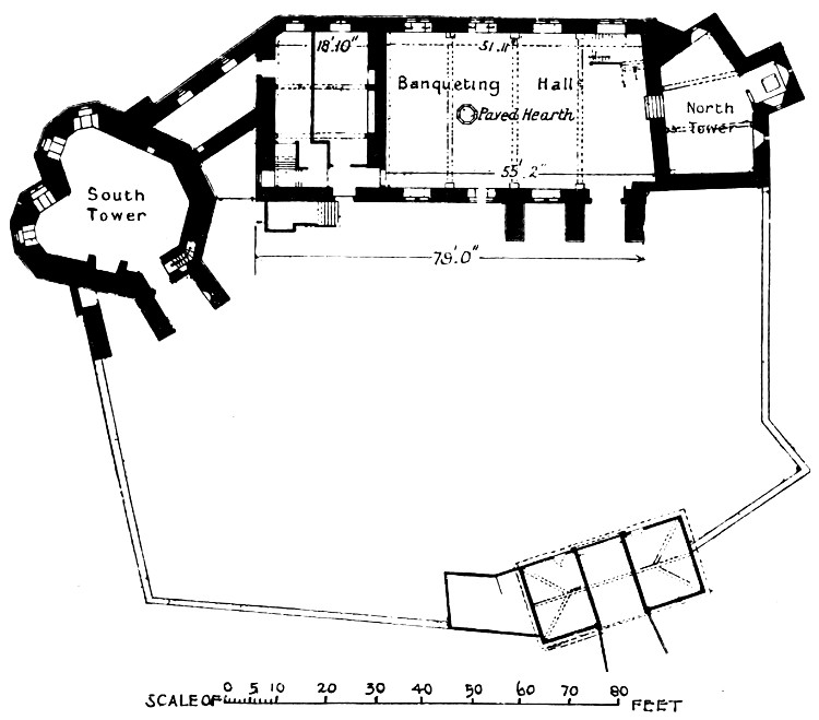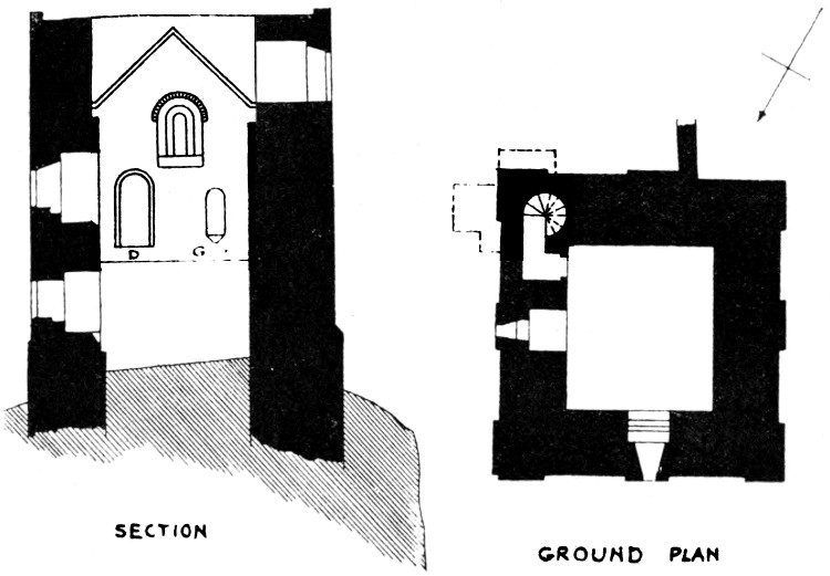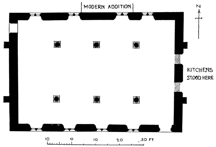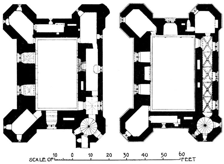 Then came the roof, round which was a rampart walk protected by the battlements, and leading to the four angle turrets which rose above the general mass of the building. Access to these various floors was given by a commodious circular staircase more than 11 ft. in diameter. There were thus four main rooms; the basement, the entrance floor, the hall of two storeys, and the room over it. All these, except the basement, were warmed by a large fireplace, and lighted—if lighted it can be called—by eight small windows. The hall had in addition eight two-light windows in the triforium.[10] There is no room which can be identified as the kitchen; there is no indication that the windows were glazed.