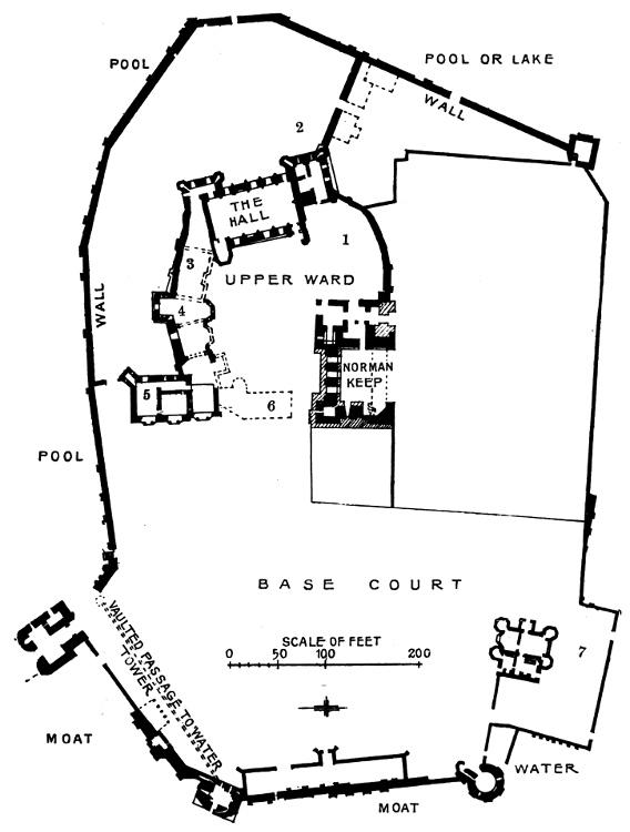The “castles” of the Conqueror were probably merely the huge earthworks which he found scattered throughout the land. Any new works which he caused to be made were probably of wood. It was not until the middle of the twelfth century that stone buildings superseded to any great extent these wooden structures; at least few existing remains can be dated earlier than then; and it is in the midst of the great ditches of these earthen “castles” that many of the stone keeps of that time were built, the encircling outer mounds being further strengthened by stone walls.