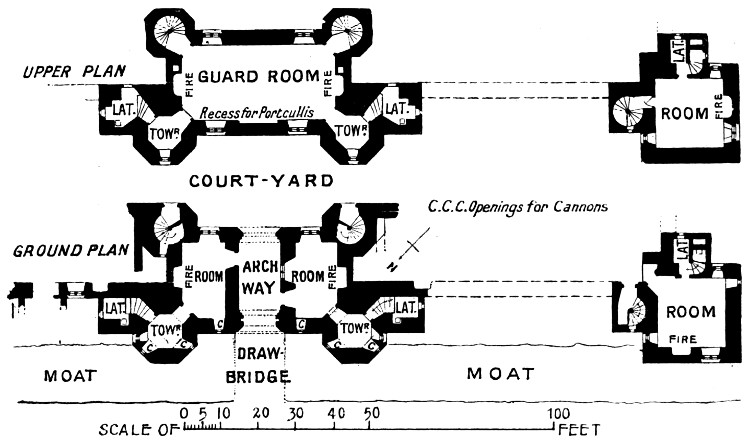 The keep was the domestic part of the castle; it contained the rooms used by the owner and his family. Surrounding it at some distance was the outer wall strengthened according to circumstances by projecting towers and entered through a fortified gatehouse. The extent and intricacy of the defences varied according to the importance of the castle; but these matters belong rather to military architecture than to domestic, and all that need be said is that those retainers who overflowed from the towers and other permanent buildings were[4] housed in temporary wooden buildings within the courtyard.