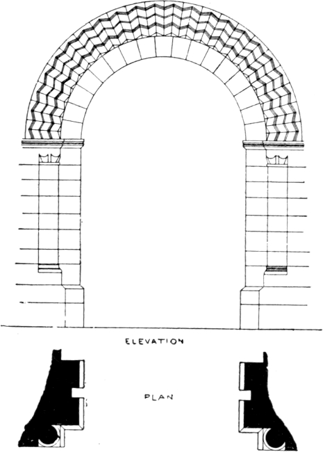 Against the means of attack which were then available this place was impregnable, but the safety thus assured must have been both gloomy and draughty. In its way, however, it was a lordly residence; the main rooms were spacious, the smaller rooms were considerable in number, the staircase was of ample width. The gallery must have afforded a certain amount of quasi-privacy to those who were not privileged to occupy the mural chambers. The architectural detail of the doorways, windows, arches, and fireplaces is good (Figs. 4, 5, 6). Across the middle of the entrance floor and of the hall is thrown a fine bold semicircular arch, of nearly 30 ft. span, to carry the floor of the room over (see section, Fig. 5); the whole treatment is simple, sturdy, and splendid, as befitted the chief stronghold of[12] the race for whom it was built, the De Veres, Earls of Oxford.