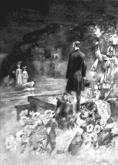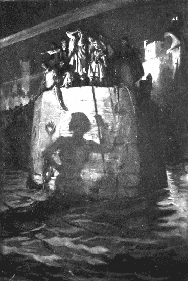 Religious silence took the place of the tumult of voices. They could see distinctly in the boat two young women holding each other by the hand. Each of them was dressed with great simplicity: it was Helia and Ethel. The light of the torches flashed vividly upon them. They seemed to rise out of the night; and when the sailors 470 lifted their oars to disembark them on the landing where the duke was waiting, there was not a gesture, not a cry. The people heeded only them. No attention was given to the two personages following them, a young girl and a young man—Suzanne and Phil.