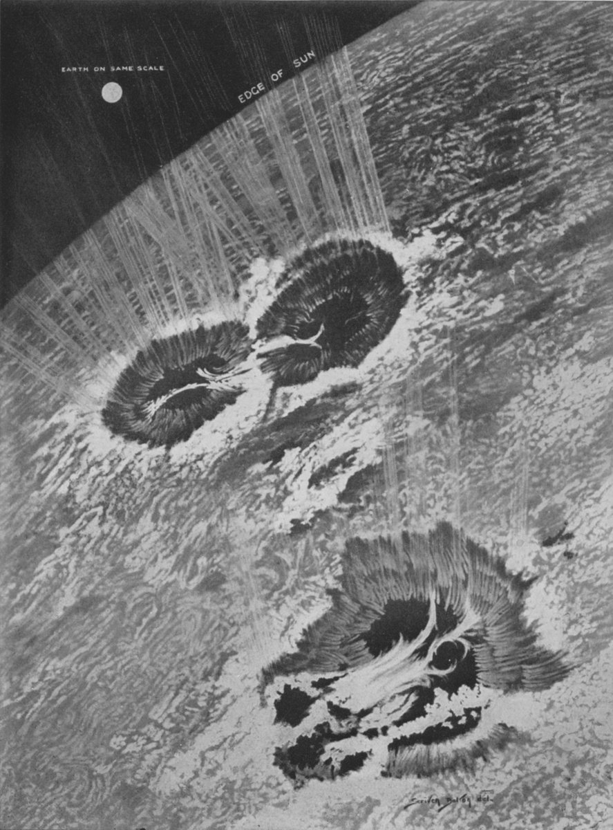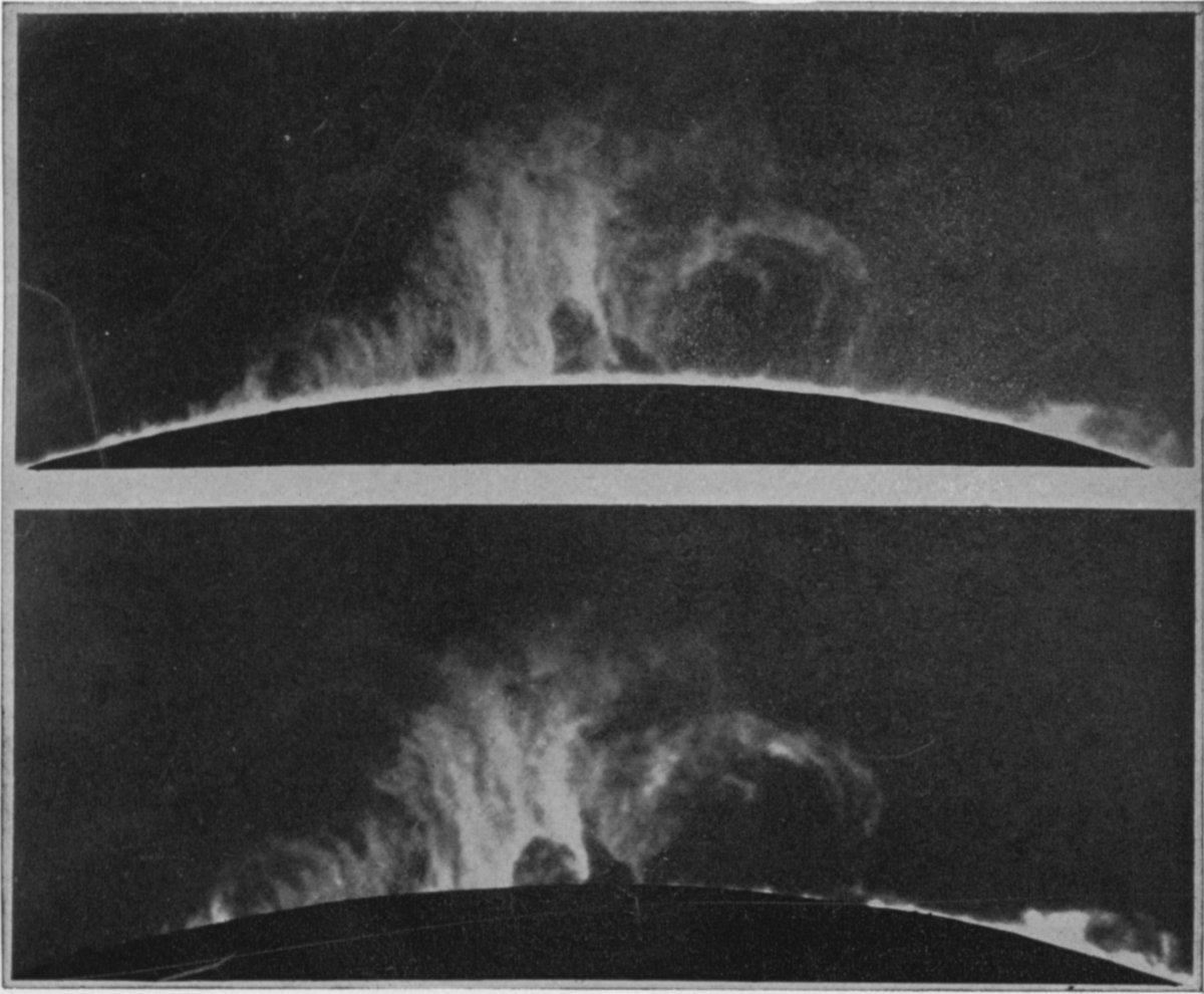 THE GREAT SCARLET SOLAR PROMINENCES, WHICH ARE SUCH A NOTABLE FEATURE OF THE SOLAR PHENOMENA, ARE IMMENSE OUTBURSTS OF FLAMING HYDROGEN RISING SOMETIMES TO A HEIGHT OF 500,000 MILES