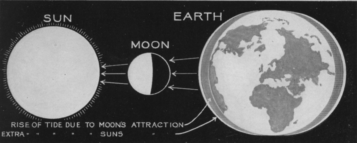 But it was part of the merit of Newton's mighty theory of gravitation that it furnished an explanation even of this age-old mystery. We can see, in broad outlines at any rate, that the theory of universal attraction can be applied to this case. For the moon, Newton taught us, pulls every particle of matter throughout the earth. If we imagine that part of the earth's surface which comprises the Pacific Ocean, for instance, to be turned towards the moon, we see that the moon's pull, acting on the loose and mobile water, would tend to heap it up into a sort[Pg 291] of mound. The whole earth is pulled by the moon, but the water is more free to obey this pull than is the solid earth, although small tides are also caused in the earth's solid crust. It can be shown also that a corresponding hump would tend to be produced on the other side of the earth, owing, in this case, to the tendency of the water, being more loosely connected, to lag behind the solid earth. If the earth's surface were entirely fluid the rotation of the earth would give the impression that these two humps were continually travelling round the world, once every day. At any given part of the earth's surface, therefore, there would be two humps daily, i.e. two periods of high water. Such is the simplest possible outline of the gravitational theory of the tides.