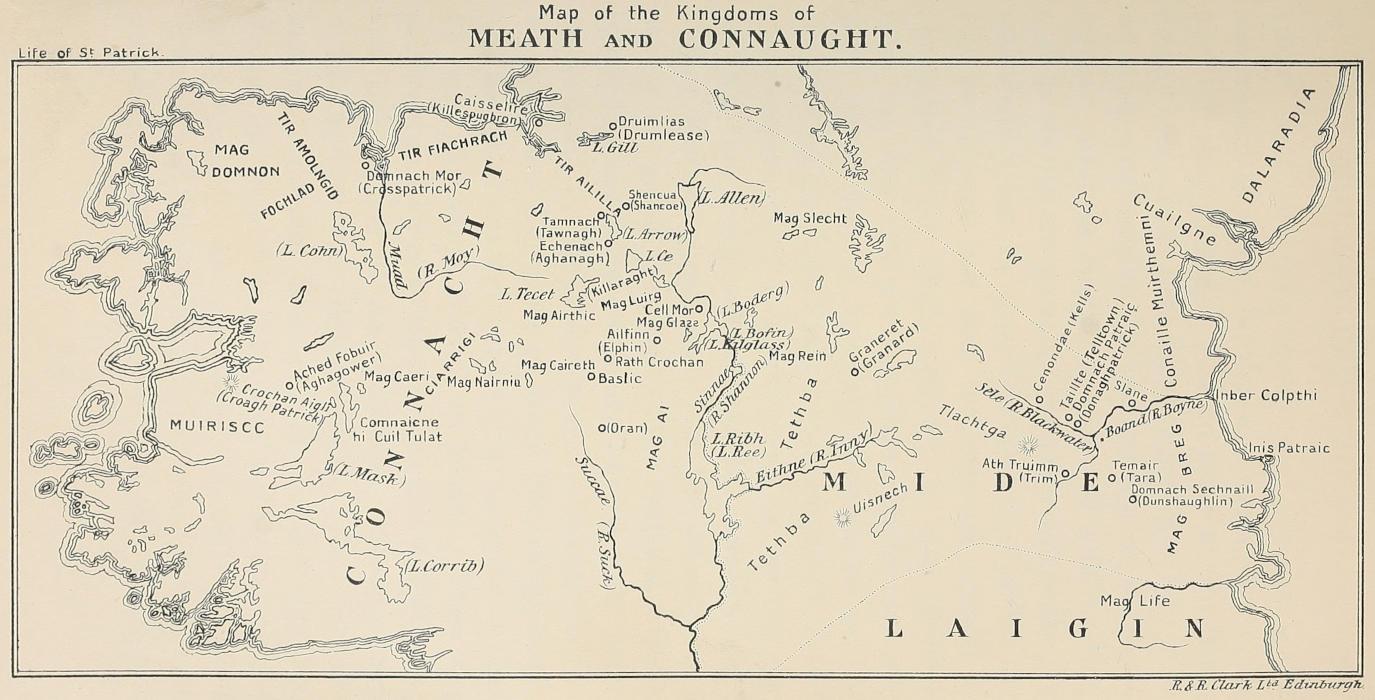 The two maps are merely intended to help the reader to see the whereabouts of some places which he might not easily find without reference to the Ordnance Survey. I consulted Mr. Orpen’s valuable map of Early Ireland (unfortunately on a small scale) in Poole’s Historical Atlas of Modern Europe. But he has used material which applies to a later period, and I have not ventured to follow him, for instance, in marking the boundary between the northern frontiers of the kingdoms of Connaught and Meath.