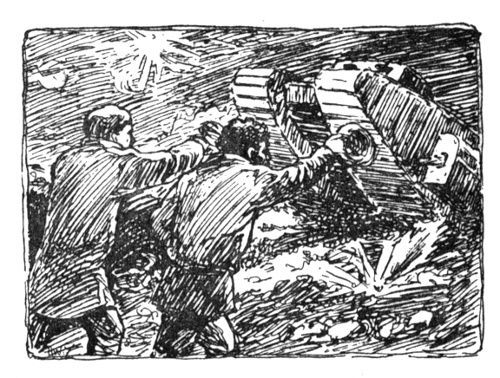 With that they both jumped into the plane, fixed the straps, and flew away. Only just in time, however, for bullets and shells soon began once more to liven things up. The plane dived, and swooped, and looped the loop until Henare thought his woolly head would drop off. They then had a safe run for an hour, but just as the aeroplane was crossing the German lines she was winged and had to descend in No-Man's-Land. Enemy searchlights soon discovered where they landed, and shells started to dance and sing all around them. The two men left the machine just before it was blown to pieces. They hid for awhile in a crater, until the welcome sound of a tank was heard. Presently she was seen lumbering along in the moonlight. Henare and the Irish airman made for her [pg 41] with all haste, waving their caps. The tank lurched towards them suspectingly, and then came to a standstill.