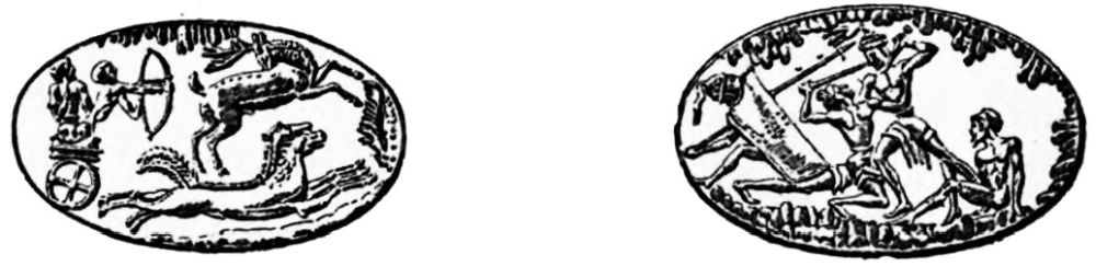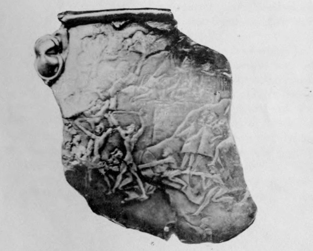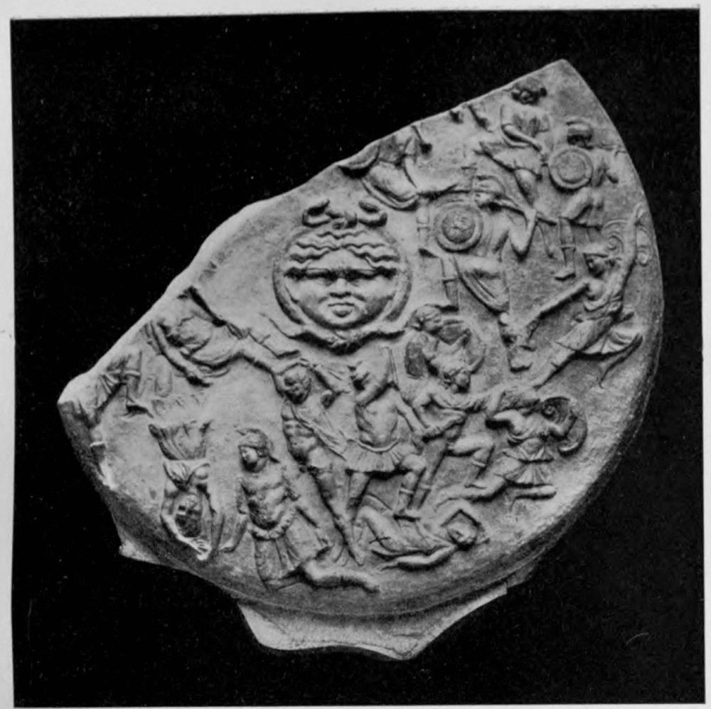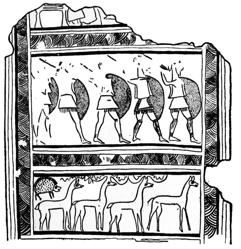 | Collotype plate, from the facsimiles in the British Museum, as Plate 9. See p. 38. The subject is the siege of a city. We observe that here, as in the previous illustrations, the warriors are represented as almost naked. They fight with slings and arrows and protect themselves with huge shields of wicker{xv} | ||