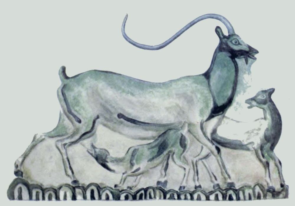 | Painted from the facsimiles in the Ashmolean Museum, Oxford, by Diana R. Wilson, by special permission. See p. 22. According to Greek mythology Zeus was suckled by a she-goat in Crete | ||