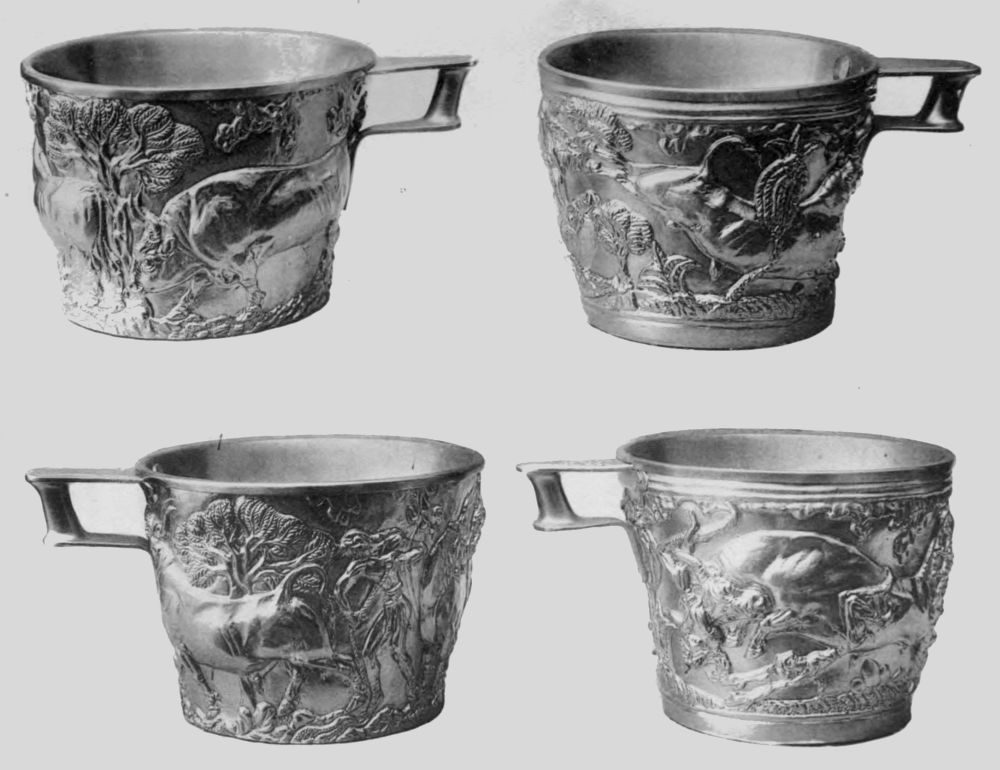 | Collotype plate, from the facsimiles in the British Museum, First Vase Room, Case B. Two gold cups found on Spartan territory. The design is in relief beaten up from the back. One shows the trapping of wild cattle, the other tame cattle going to pasture. The vessels are about the size of the modern teacup. See p. 30 | ||
