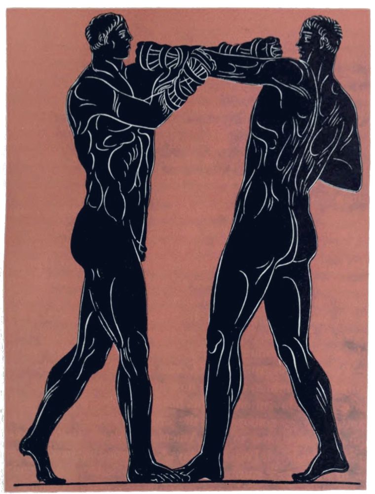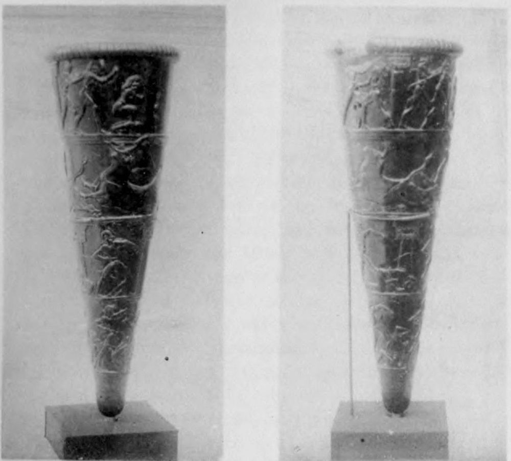 | These vases were originally covered with gold-leaf. The subjects have not yet been completely explained. Probably the whole vase deals with athletic combats: running and leaping on the top zone, bullfighting on the second, and boxing on the third and fourth | ||