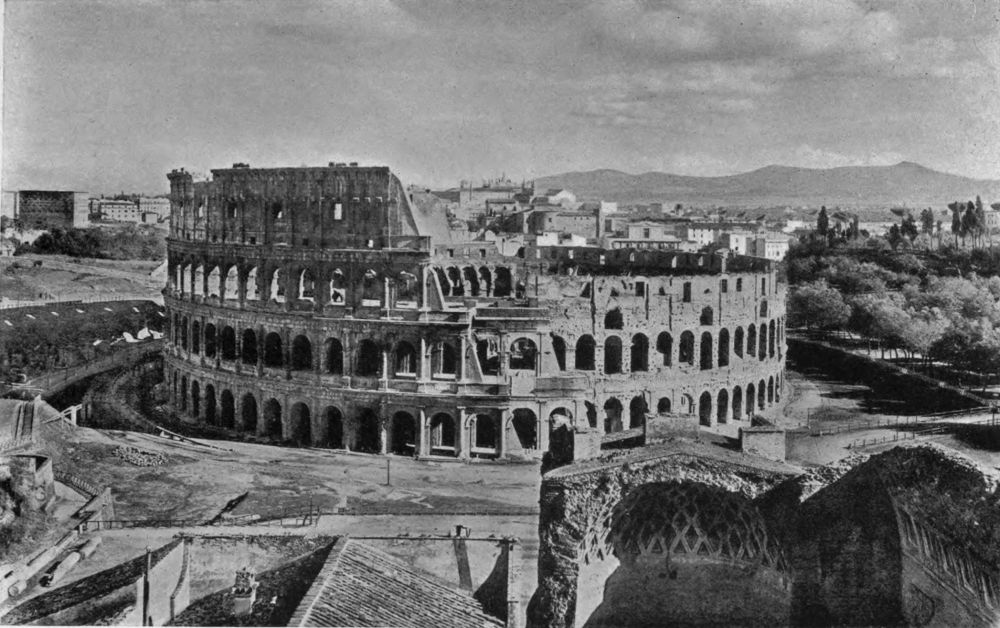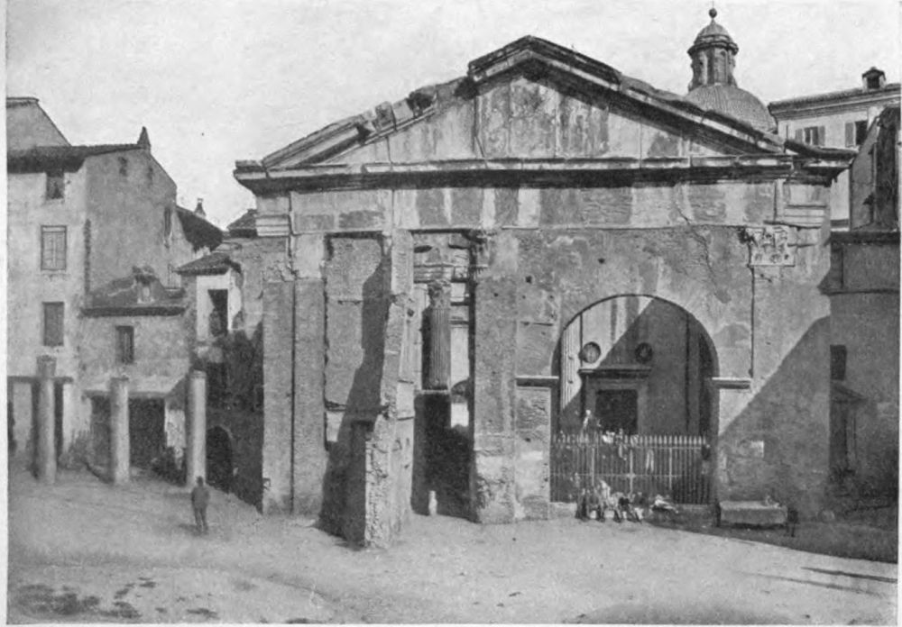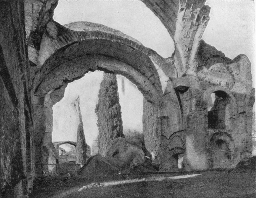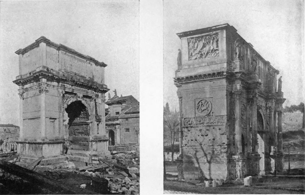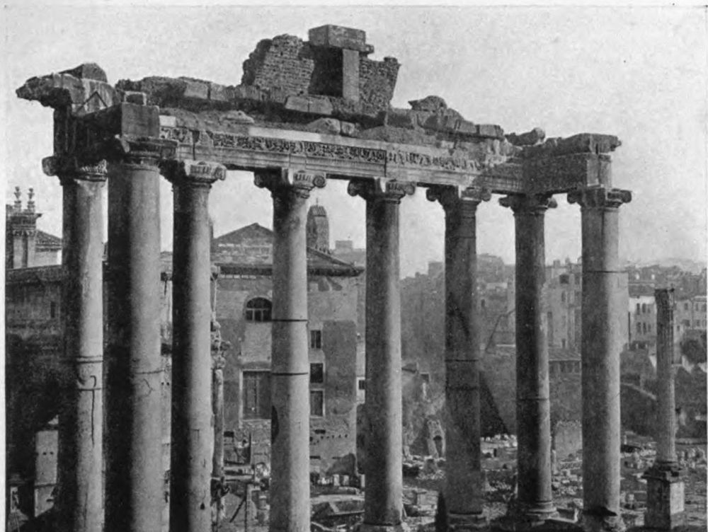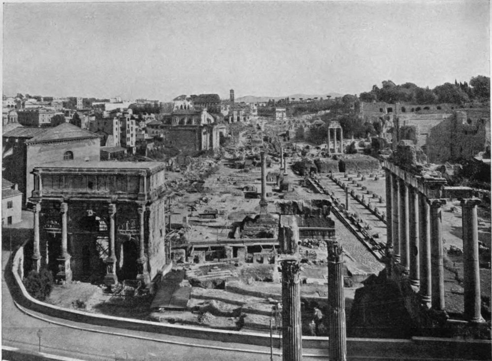 | From a photograph by Anderson. The view is taken from the Capitol, looking S.E. at the Arch of Titus, on the left of which part of the Colosseum is visible. The background on the right is filled by the Palatine Hill and the substructures of Caligula’s Palace, in front of which the walls of the Temple of Augustus are visible. To the right of the middle are three columns and part of the entablature of the Temple of Castor. In the centre is the Column of Phocas. The foreground is occupied by the Arch of Severus (l.) the Temple of Saturn (r.) and two Corinthian columns of the Temple of Vespasian | ||