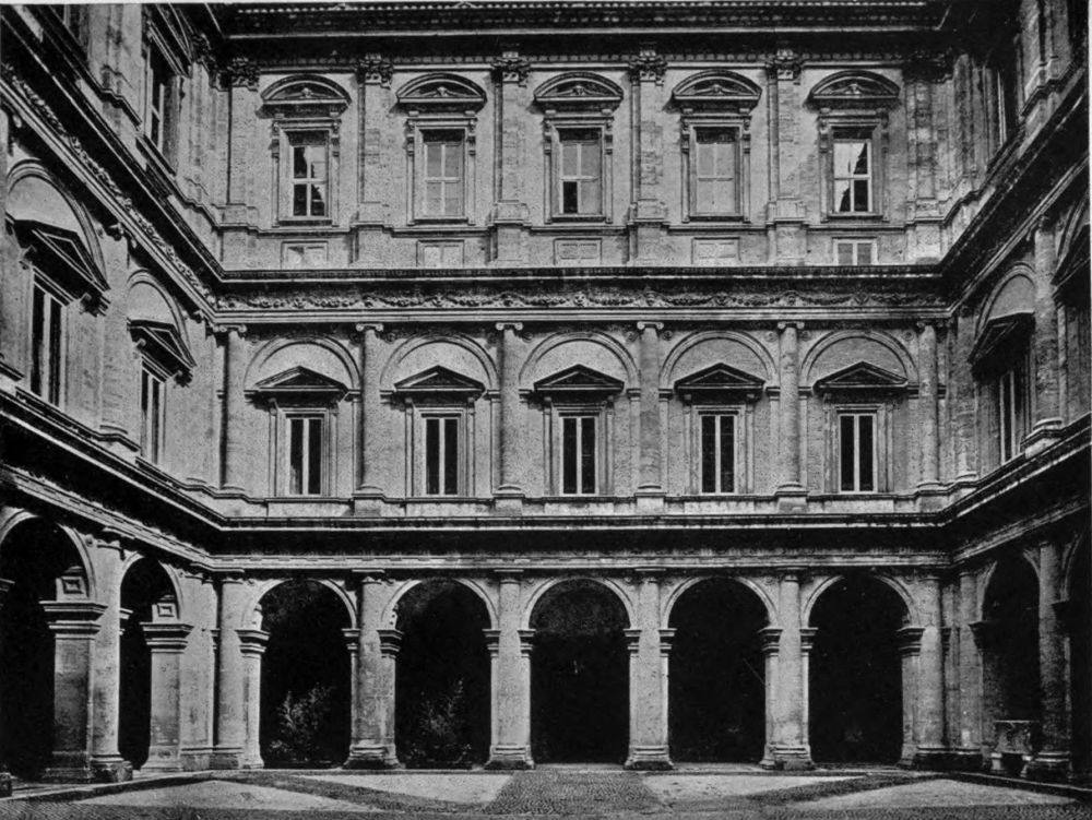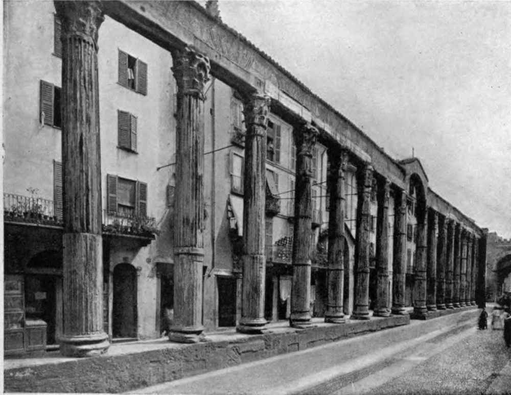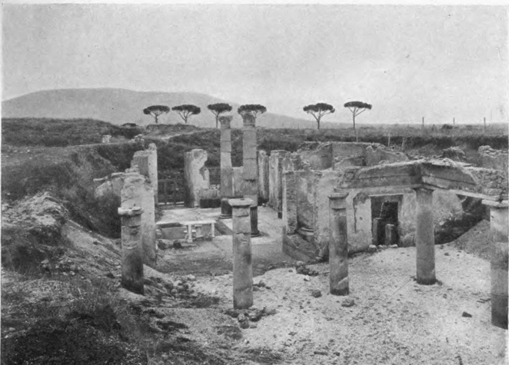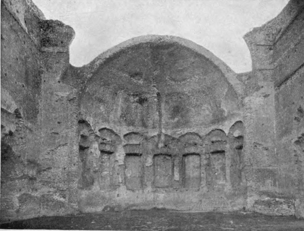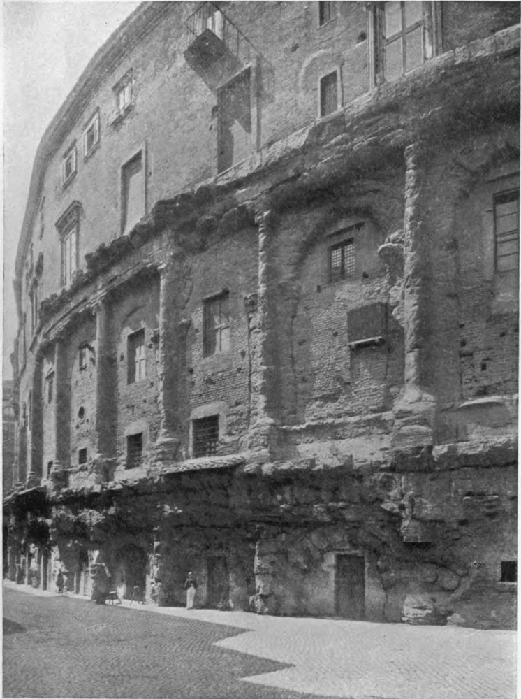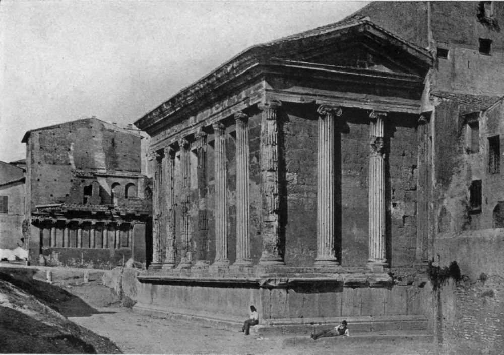 | From a photograph by Anderson. The view is taken from the Capitol, looking S.E. at the Arch of Titus, on the left of which part of the Colosseum is visible. The background on the right is filled by the Palatine Hill and the substructures of Caligula’s Palace, in front of which the walls of the Temple of Augustus are visible. To the right of the middle are three columns and part of the entablature of the Temple of Castor. In the centre is the Column of Phocas. The foreground is occupied by the Arch of Severus (l.) the Temple of Saturn (r.) and two Corinthian columns of the Temple of Vespasian | ||