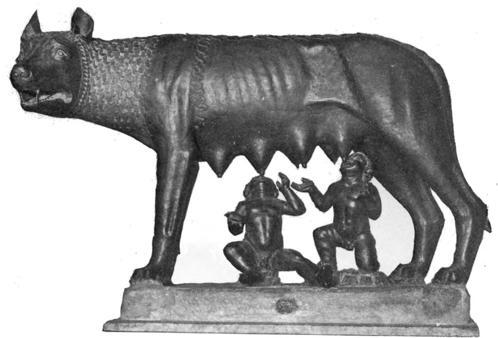 | From a photograph by Anderson of the original bronze in the Palace of the Conservatori, Rome. The wolf herself is ancient, probably of Etruscan workmanship. See p. 18 | ||