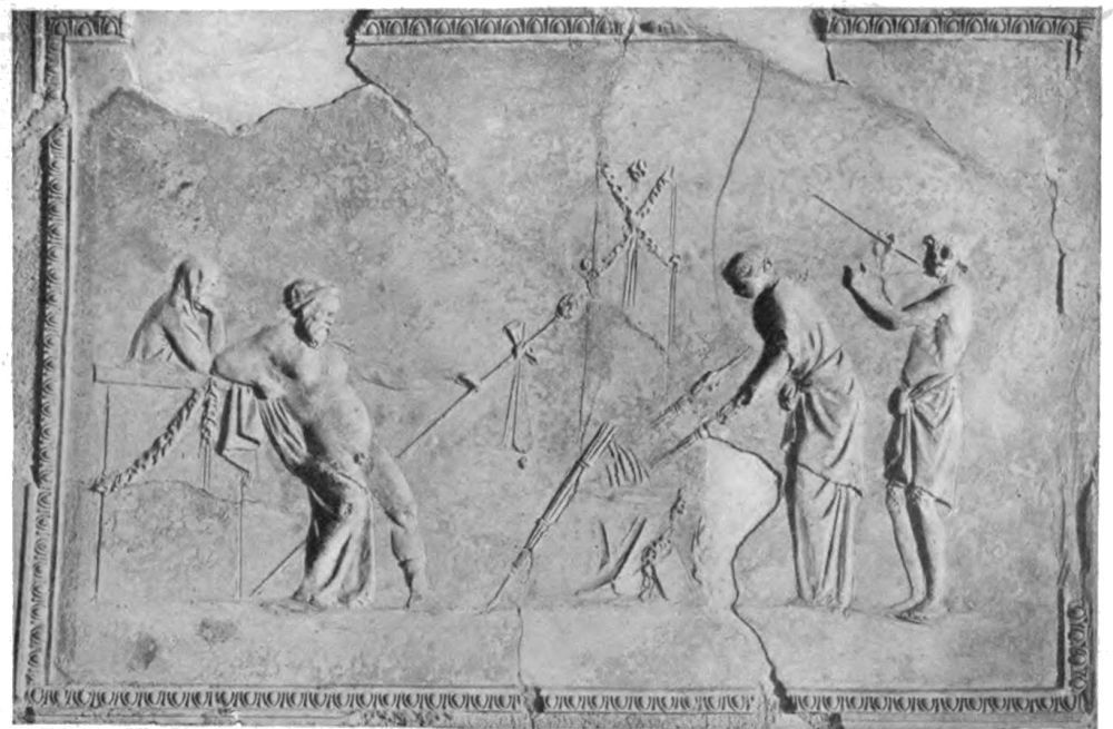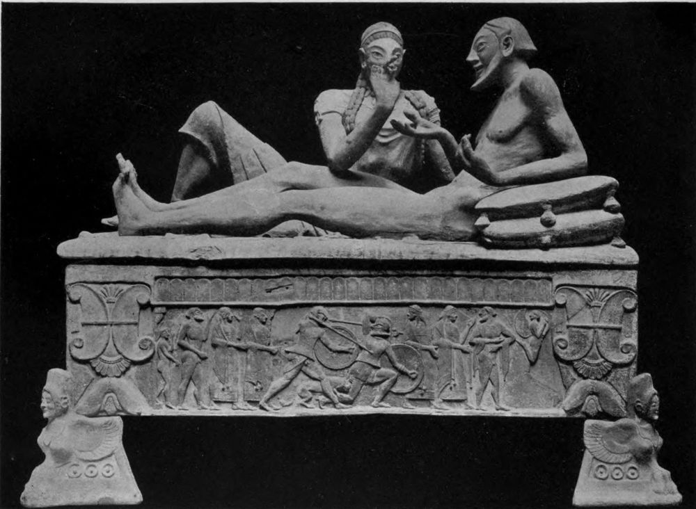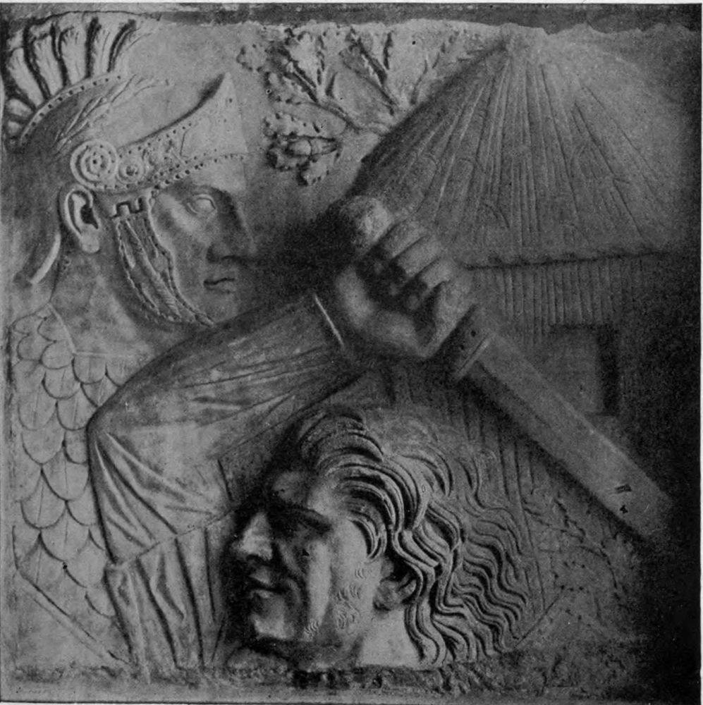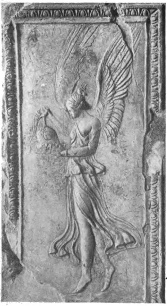 | From a photograph by Mansell & Co. of the original in the Terra-cotta Room, British Museum. The reader will notice the close resemblance of this work, particularly the relief depicting the battle and the mourners, to Greek relief-work of the sixth century B.C. | ||