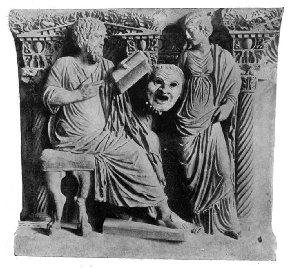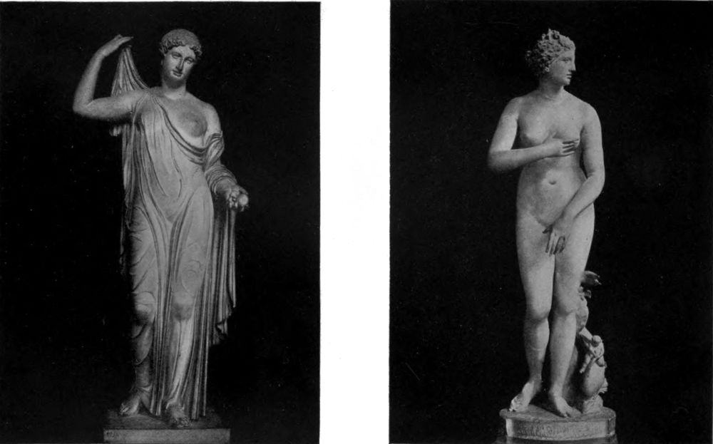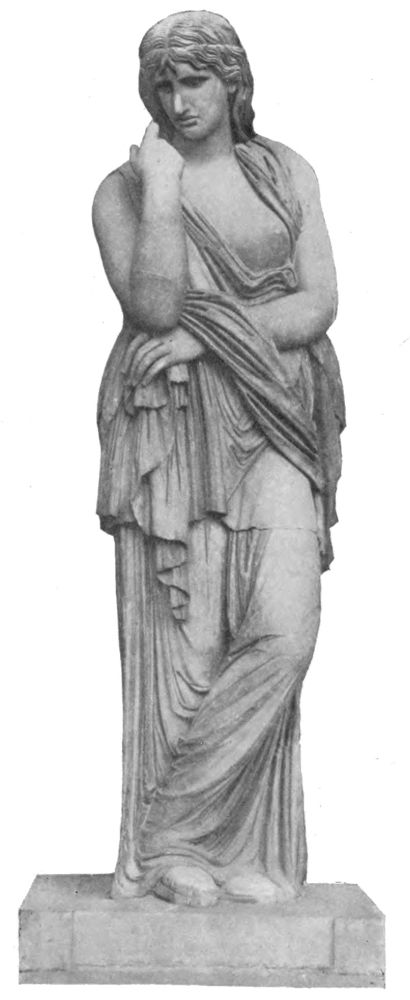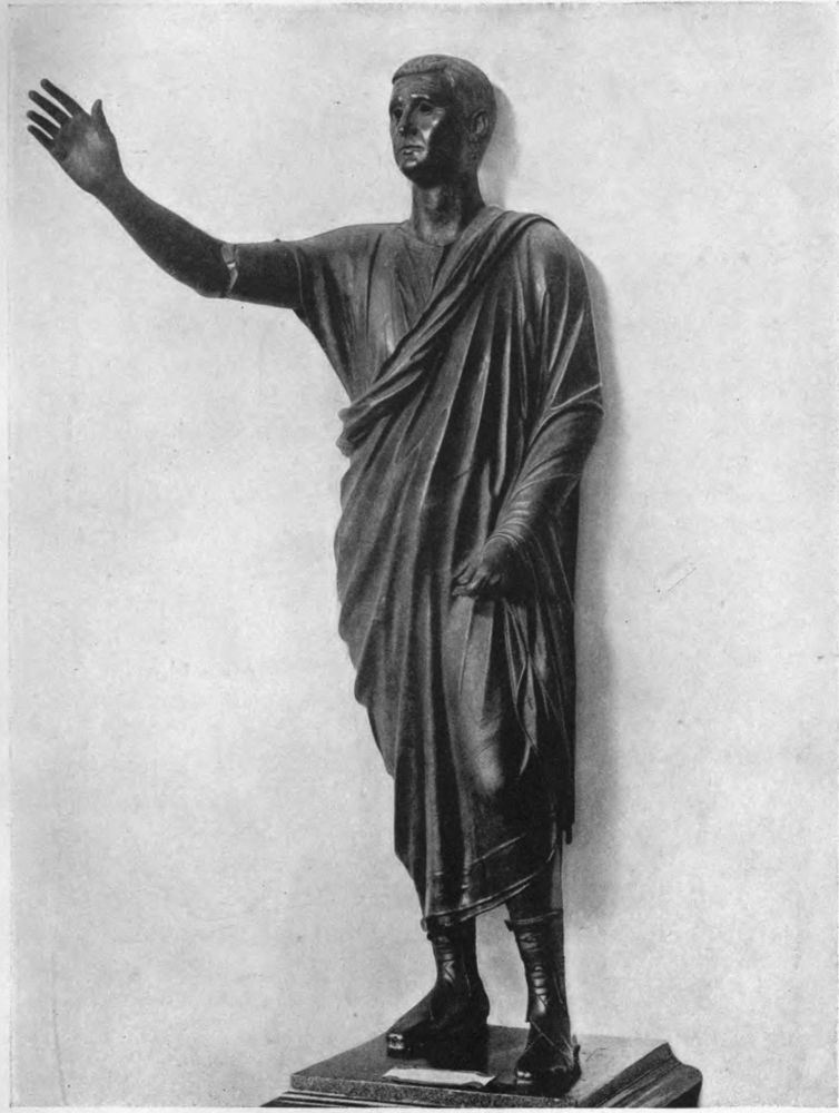 | From a photograph by Almari of the original bronze statue in the Archæological Museum, Florence. One of the rare examples of early republican portraiture, found near Lake Trasimene, a statue of Aulus Metilius (unknown to history) in the guise of an orator. It is assigned to the end of the third century B.C., and is said to represent the transition between Etruscan and Roman portraiture. I think, however, that it would be true to describe it as a Roman head, probably copied from a death-mask, upon a Greek body. Where is the Etruscan element? | ||