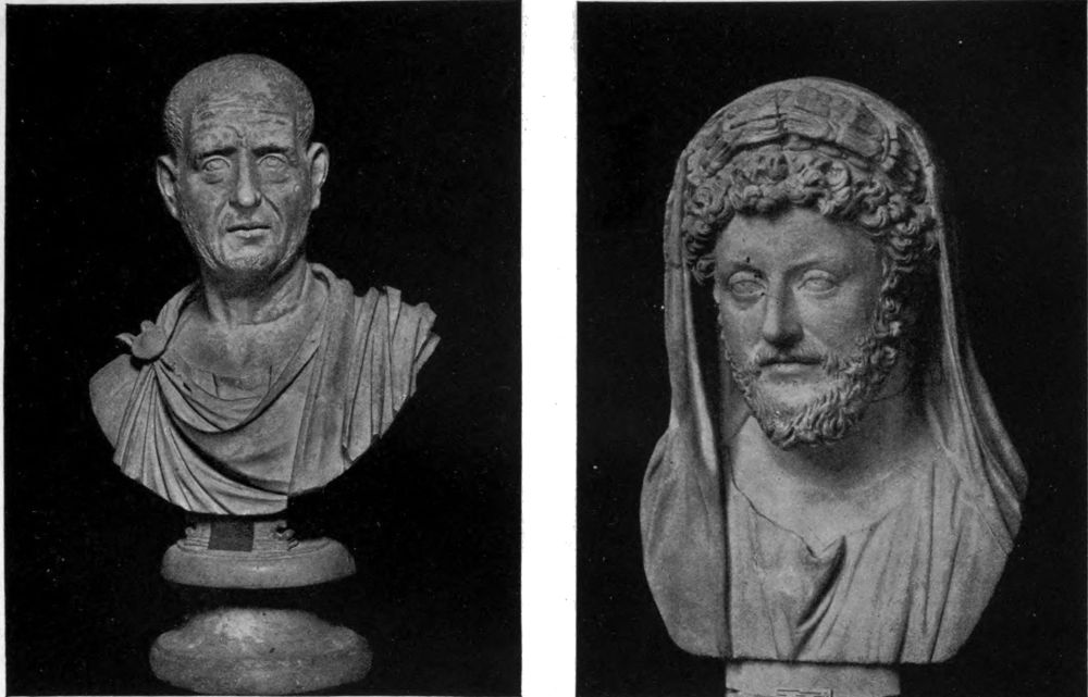 The pictures are an integral part of my scheme. It is not possible with Rome, as it was with Greece, to let pictures and statues take the place of wars and treaties. Wars and treaties are an essential part of the Grandeur of Rome. They should have a larger place here, were they less well known, and were there less need to redress a balance. But the pictures are chosen so that the reader’s eye may be able to gather its own impression of the Roman genius. When the Roman took pen in hand he was usually more than half a Greek, but sometimes in his handling of bricks and mortar he revealed himself. For this reason—and because I must confess not to be a convinced admirer of “Roman Art”—there is an attempt to make the illustrations convey an impression of grand building, vast, solid, and utilitarian, rather than of finished sculpture by Greek hands. Pictures can produce this impression far more powerfully than words. Standing in the Colosseum or before the solid masonry of the Porta Nigra at Trier, one has seemed to come far closer to the heart of the essential Roman than ever in reading Vergil or Horace. The best Roman portraits are strangely illuminating.