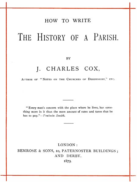 The fullest and best information respecting the parish as a unit of the national life, with much that pertains to the history of its various officers from the earliest times, will be found in Toulmin Smith’s “The Parish; its powers and obligations.” The second and best edition was published in 1857 by H. Sweet, Chancery Lane.