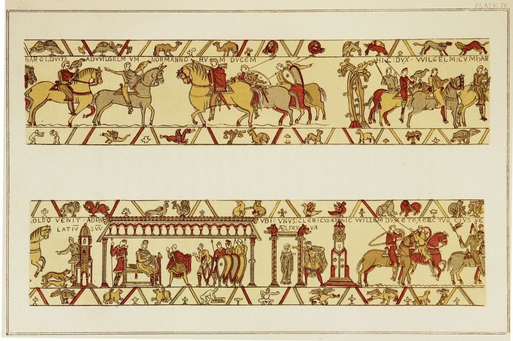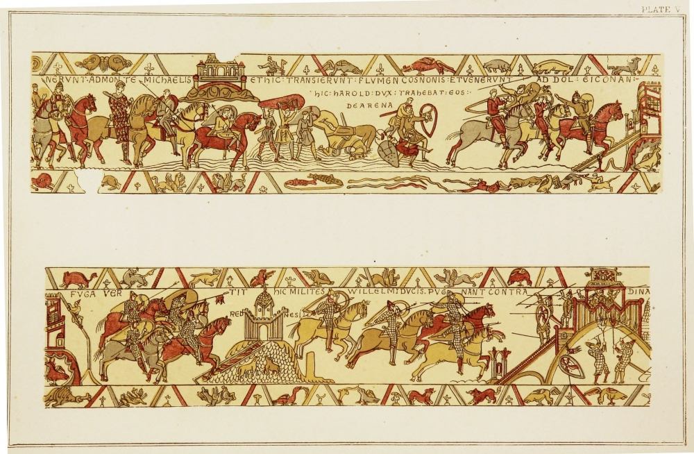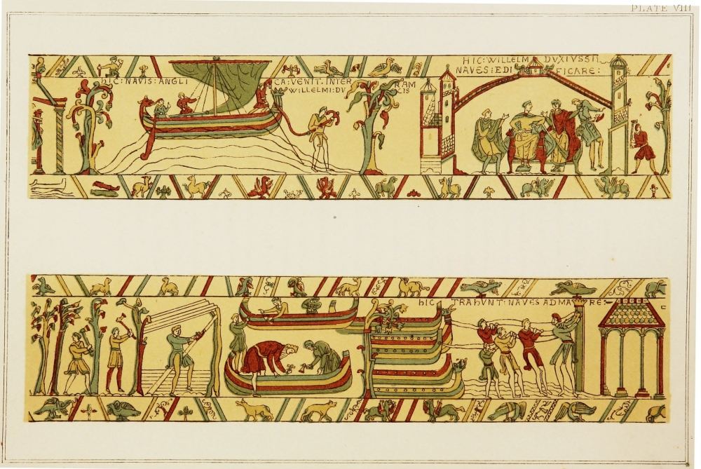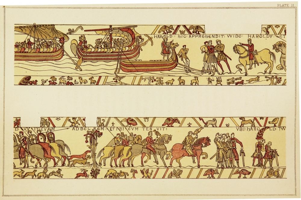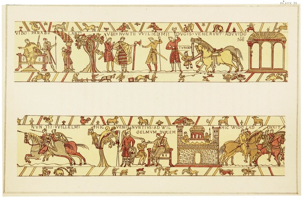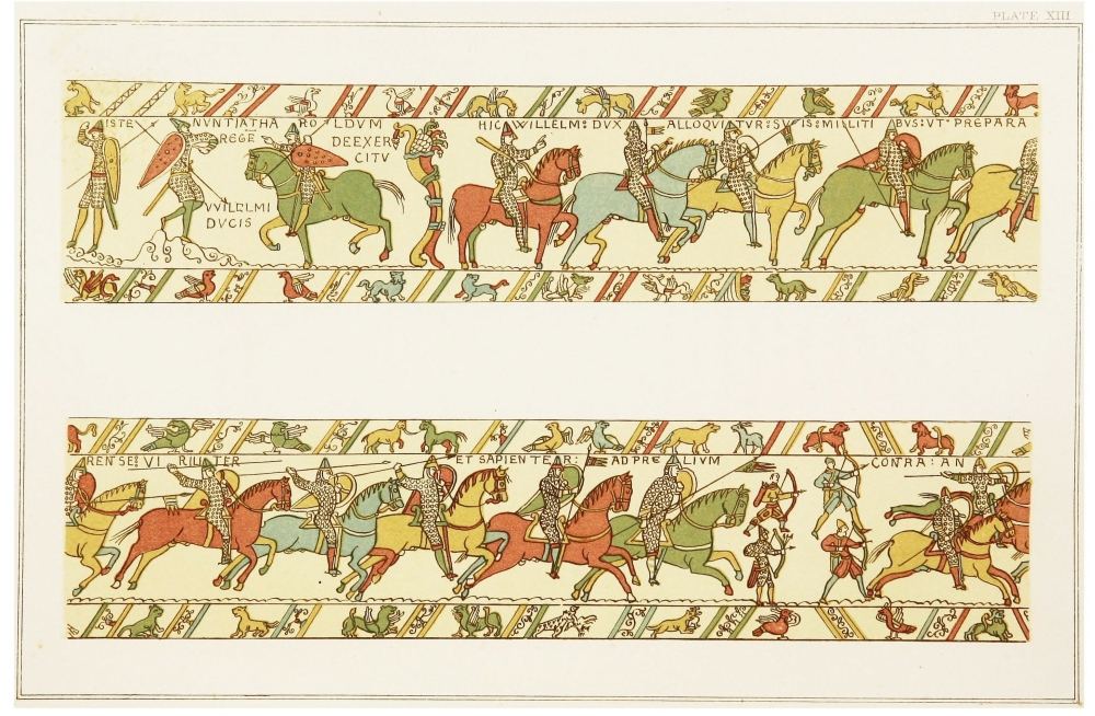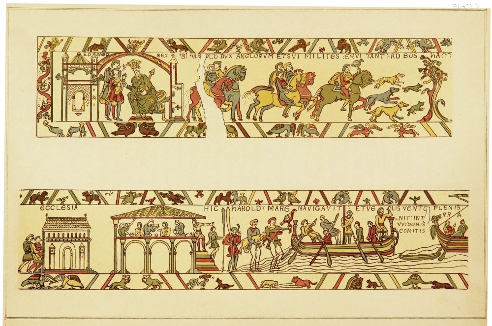 No contemporary historian indeed tells us that the Tapestry was made by Matilda. It is not mentioned in her will, or the Conqueror’s. The inventory of the treasures of the church at Bayeux, bearing date 1369, and which is the earliest document mentioning the Tapestry, contains no allusion to Matilda. Another inventory, made in 1476, and professing to be a descriptive catalogue of the jewels, ornaments, books, and other valuables of the church, mentions the Tapestry, describes its form and subject, and names the period of its public exhibition; but gives no hint that it was made at the command of Matilda. It is difficult, it may even be impossible, satisfactorily to account for the absence of all allusion to the Queen in these documents, but negative{12} arguments prove little. Besides, the case is by no means singular. The compilers of ancient documents seem to have left much to be taken for granted. Sir Henry Ellis, in his General Introduction to Domesday, says, “Of Queen Matilda’s gifts to foreign monasteries, two only are particularly specified in the Survey; the land at Deverel in Wilts, which she gave to St. Mary at Bee; and two hides at Frantone in Dorset, which she gave to the Conqueror’s foundation of St. Stephen at Caen. No mention occurs of the Conqueror and his Queen having founded the monasteries of St. Stephen and the Holy Trinity in that city: although their lands in England are specified.”[14] It is scarcely less difficult to account for these omissions in the Domesday Book, than it is to account for the absence of all allusion to the framer of the Tapestry by contemporary writers. In the absence of direct evidence, we are thrown upon probabilities. And what is more likely than that the opinion which Montfaucon found prevailing at Bayeux when he discovered the Tapestry is the correct one? As the Abbé de la Rue himself argues, “To have undertaken this Tapestry would have required a considerable degree of interest in the subject of it, and to have possessed the necessary powers for its execution.”[15] Who can be supposed to have had so great an interest in the establishment of the Conqueror’s right to the throne of England as Matilda of Flanders, and who but herself would have been at the trouble of asserting it in such full detail? Would any one but an immediate connexion of the Duke’s have taken such prominent notice of the{13} rescue of Harold from his captivity in Ponthieu, and of his subsequent friendly intercourse with William in Brittany; and would even Matilda herself have done this if the Tapestry had been prepared after the stupendous results of the battle of Hastings had fully developed themselves?