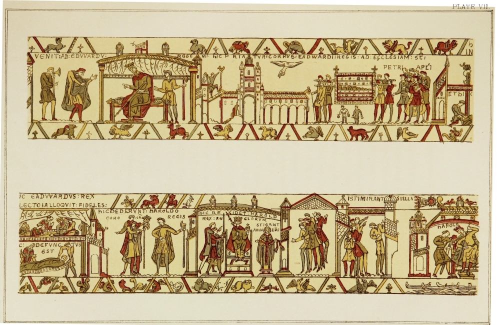 The subject of this interview is no doubt Harold’s intended expedition to the court of William. Unhappily, there is no point in history respecting which a greater diversity of statement exists among contemporary writers, than the visit of Harold to the court of William. Three views are taken of it:—one is, that Harold was commissioned by Edward to inform the young Duke of Normandy that he had been nominated by him as his successor to the throne; another is, that Harold, whilst taking recreation in a fishing-boat, was accidentally carried out to sea, and driven on the shores of Ponthieu; the third is, that Harold had begged permission of Edward to go into Normandy, in order to release from captivity two relatives, a brother and a nephew, who, after Earl Godwin’s rebellion, had been placed as hostages in the hands of the Norman duke. The question for us to consider is which is the view countenanced by the Tapestry. Unfortunately, the inscription over the group is simply EDWARD REX, and, so, gives us no definite information. It will be well to examine the statements of the chroniclers, and then compare them with the representations of our worsted work.{25}