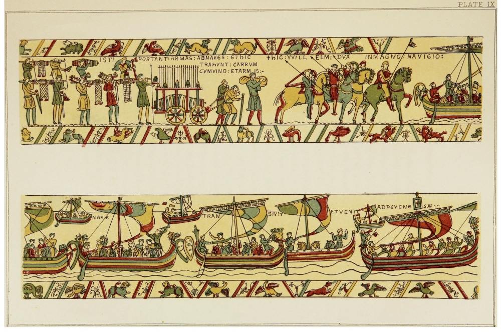 We must at once abandon the fishing boat story. The preparation which Harold makes for his expedition, and the numbers he takes with him, are irreconcileable with this view. Besides, the ships do not seem to be suffering from stress of weather, and, according to the inscription, Harold appears to have made a prosperous voyage, ET VELIS VENTO PLENIS, VENIT IN TERRAM WIDONIS COMITIS—And his sails being filled with the wind, he came into the territory of Count Guy.