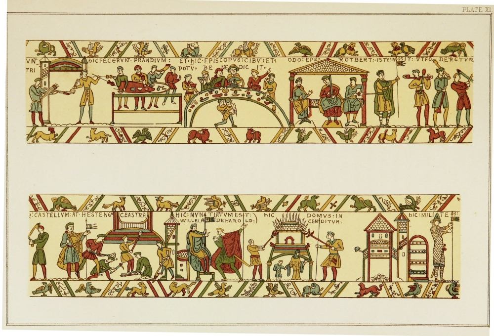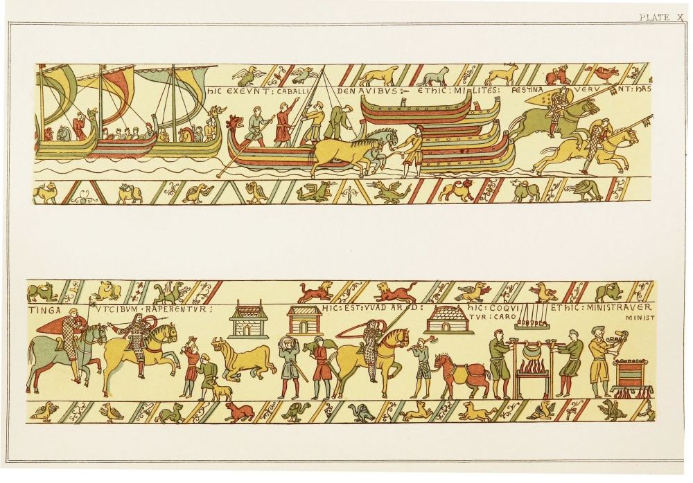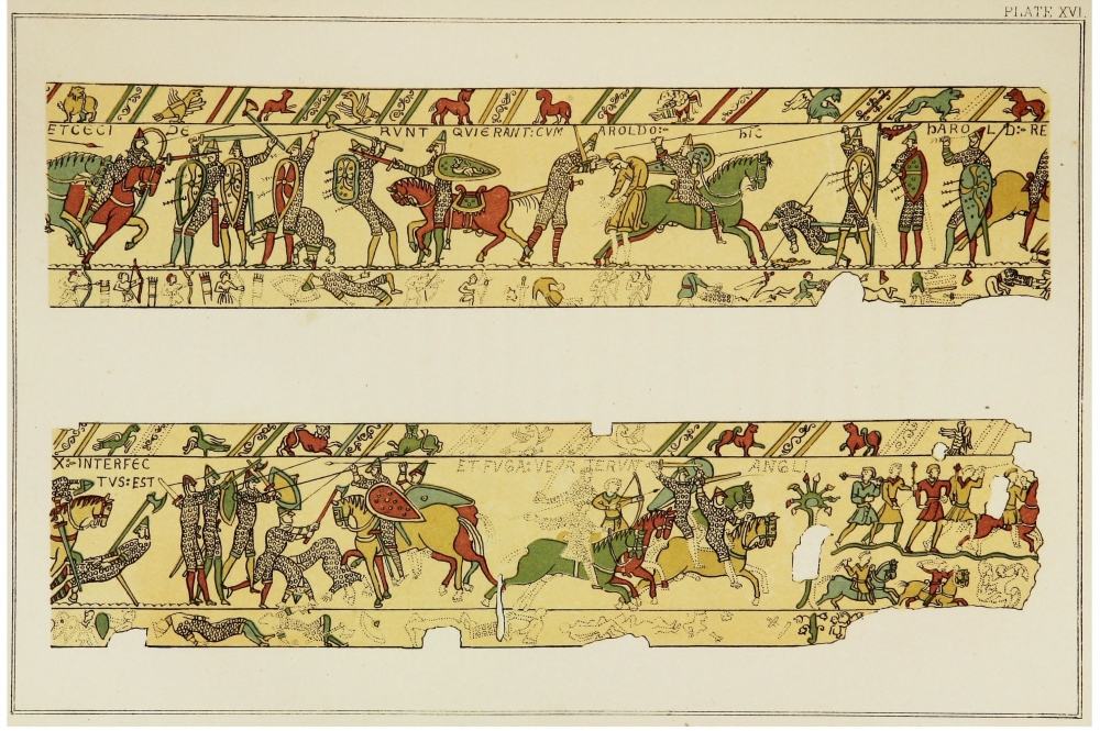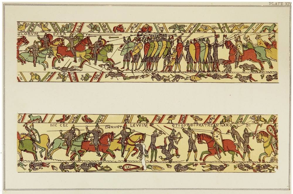 2. Again, the architecture, the dresses, the armour, the furniture, of the Tapestry are those which prevailed at the period of the Conquest, and at no other. It is at all times exceedingly difficult, whether by writing or painting, to portray accurately the manners, language, and modes of thought, of an anterior period. In mediæval times, however, the attempt was seldom made. The{6} draftsmen represented the manners “living as they rose.” “It was the invariable practice with artists in every country,” says Mr. Charles Stothard,[8] “excepting Italy, during the middle ages, whatever subject they took in hand, to represent it according to the manners and customs of their own time. Thus we may see Alexander the Great, like a good Catholic, interred with all the rites and ceremonies of the Romish church. All the illuminated transcripts of Froissart, although executed not more than fifty years after the original work was finished, are less valuable on account of the illuminations they contain not being accordant with the text, but representing the customs of the fifteenth century instead of the fourteenth. It is not likely that in an age far less refined this practice should be departed from. The Tapestry, therefore, must be regarded as a true picture of the time when it was executed.” The testimony of an earlier authority, Strutt, is to the same effect:—“To a total want of proper taste in collecting of antiquities, and application to the study of them, are owing the ignorant errors committed by the unlearned illuminators of old MSS.; and so far were they from having the least idea of any thing more ancient than the manners and customs of their own particular times, that not only things of a century earlier than their own era, are confounded together, but even representations of the remotest periods in history. The Saxons put Noah, Abraham, Christ, and King Edgar, all in the same habit, that is, the habit worn by themselves at that time; and in some MSS., illuminated{7} in the reign of Henry the Sixth, are exhibited the figures of Meleager, Hercules, Jason, &c., in the full dress of the great lords of that prince’s court. At the latter end of one of these MSS., indeed, the illuminator, reading something about a lion’s skin, has covered the shoulders of the beau Hercules with that kingly animal’s hide over his courtly load of silk and gold embroidery. Yet this is a lucky circumstance in the present want of ancient materials; for though these pictures do not bear the least resemblance of the things they were originally intended to represent, yet they nevertheless are the undoubted characteristics of the customs of that period in which each illuminator or designer lived.”[9] A comparison of Master Wace with the Bayeux Tapestry will furnish us with an illustration in point. Wace, after alluding to the negotiations which took place before the armies closed at the decisive field of Hastings, says, “As the Duke said this, and would have said more, William Fitz Osbern rode up, his horse all covered{8} with iron; Sire, said he to his lord, we tarry too long, let us arm ourselves. Allons! Allons!”[10] Now, if we look at the Tapestry, we shall find that not a single horse is equipped in steel armour; and if we refer to the authors who lived at that period, we shall find that not one of them mentions any defensive covering for the horse. Wace, who flourished in the days of Henry I. and Henry II., is the first writer who mentions horse-armour, and, excepting from the passage which has just been quoted, it could not be proved that it had been introduced even in his day. Wace is therefore probably guilty of an anachronism, and describes what happened at the close of his own time as having occurred in that of his immediate predecessors.[11] This example shows how exceedingly difficult it is to portray customs with accuracy a few years after the period in which they prevailed. Had the Tapestry been made by Matilda the Empress, as some contend, numerous similar anachronisms must have occurred.{9}