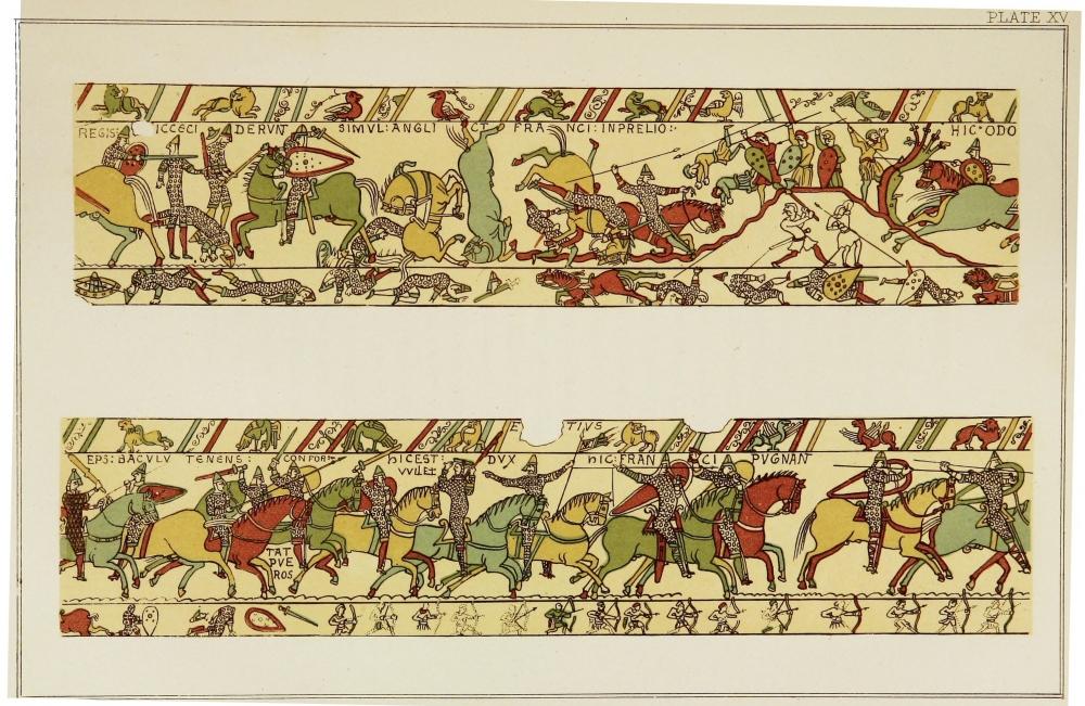 That the Tapestry should from a period beyond all record have belonged to the church of Bayeux is nothing surprising. Odo, the uterine brother of William, who rendered the Conqueror such efficient assistance in the battle of Hastings, and in the subsequent government of the kingdom, was archbishop of that place. Matilda may, with great propriety have given it to him in acknowledgement of his services, and he with equal probability, for he was very munificent to his church, may have given it to the Chapter. There is no other period at which it could with so much probability have come into the possession of the ecclesiastics of Bayeux as during the episcopate of Odo.[23]