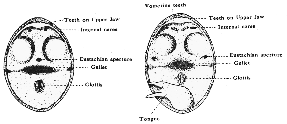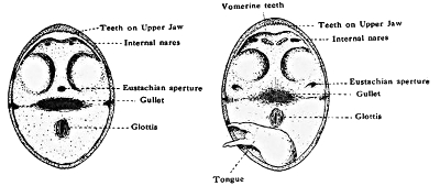 (b) There are no teeth on the vomer. [In the Frog each vomer is supplied with teeth.]