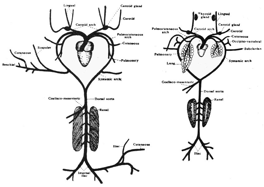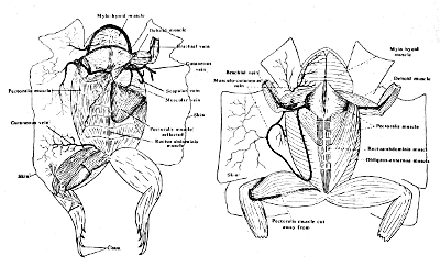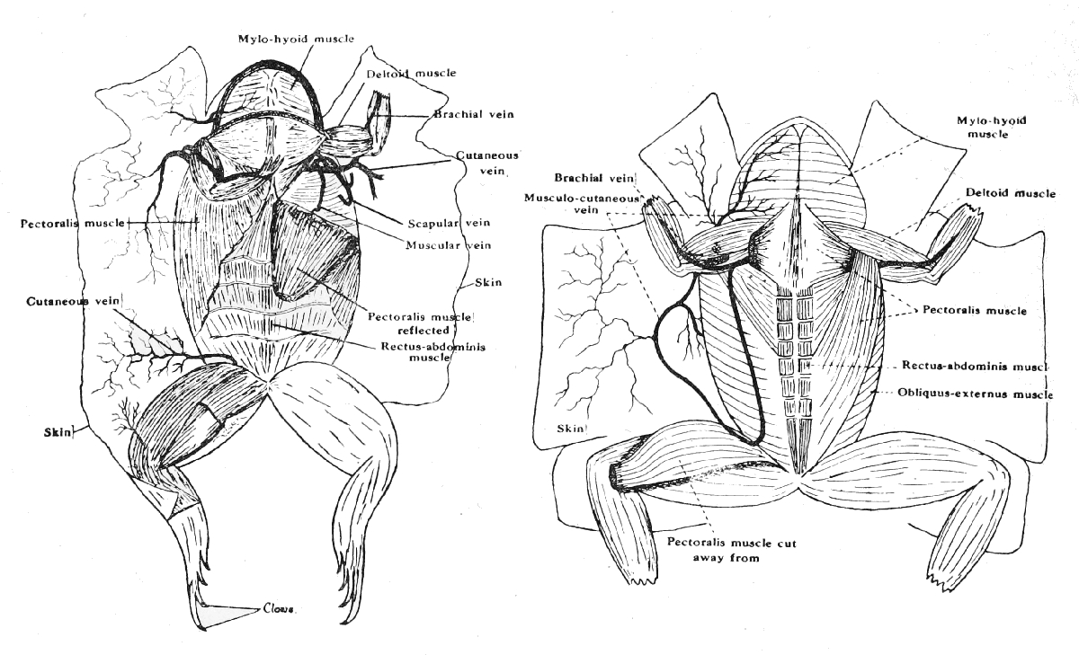 [In the Frog a single musculo-cutaneous vein is seen lying under the pectoralis muscle and extends on to the skin.]