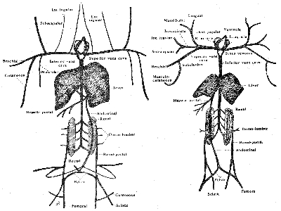 (b) The cutaneous and the muscular veins, lying under the pectoralis muscle, and arising independently from the subclavian vein. They supply the skin and muscles in the region of the arm. There is a second cutaneous vein arising from the abdominal vein and extending on to the skin of the abdomen. Two other small cutaneous veins are seen on the skin of the leg, and another on the skin under the mouth.
