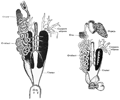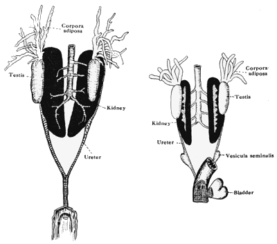[In the Frog the ureters do not join together but open separately into the cloaca. Each ureter has a slight swelling, the vesicula seminalis, on its outer side.]