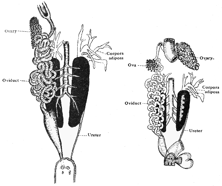 (a) The ovaries, a pair of irregularly-lobed organs usually consisting of a mass of rounded black and white bodies, the ova. The ovaries are attached to the dorsal wall of the body cavity by a fold of the peritoneum.