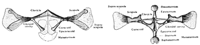1. Remove the pectoralis muscles covering the body between the arms to show the bones of the central part of the shoulder girdle and sternum, viz.:—