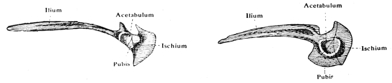 2. Detach the pelvic girdle from the transverse processes of the 9th vertebra. Remove it with the hind-limbs from the body. Detach the femur from one side of the pelvic girdle, and make a sketch showing the following parts of the pelvic girdle:—Acetabulum, ilium, ischium, and pubis.