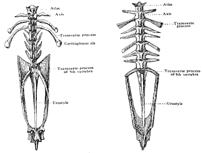 [In the Frog the transverse processes are produced outwards and they do not bear cartilaginous ribs. The urostyle is attached to the 9th vertebra by two facets.]
