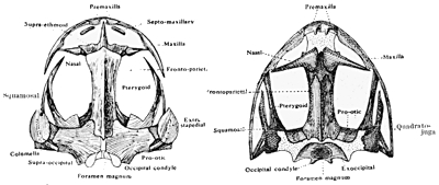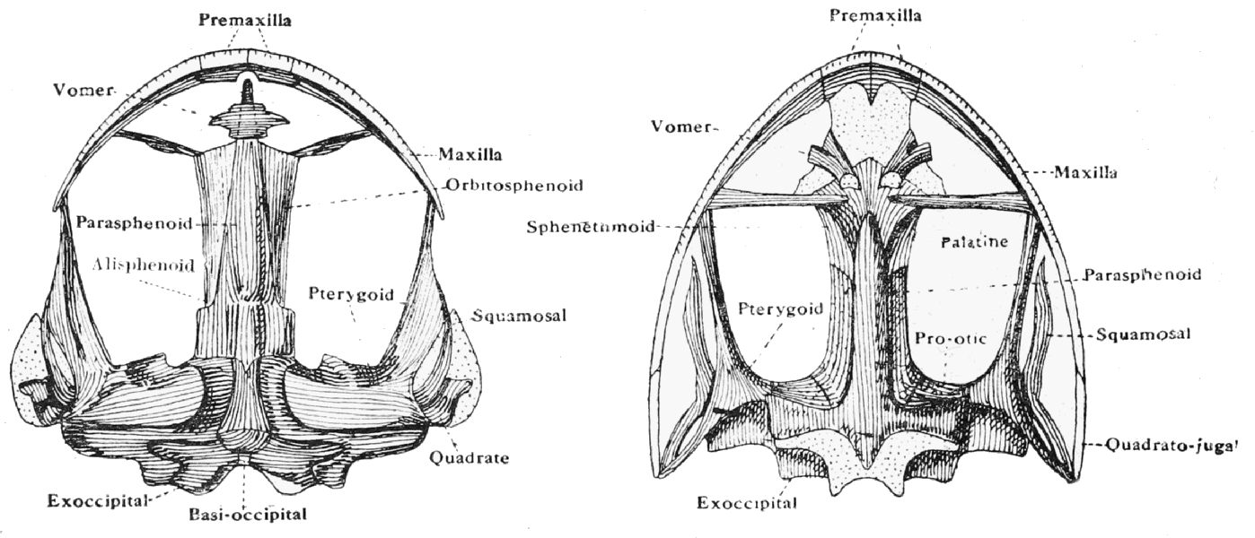[In the Frog there are a pair of vomers bearing the vomerine teeth, palatines, and quadrato-jugals. The pro-otics, which are not seen in a ventral view of the skull in the Platana, being covered over by the pterygoids, are shown in the Frog.]