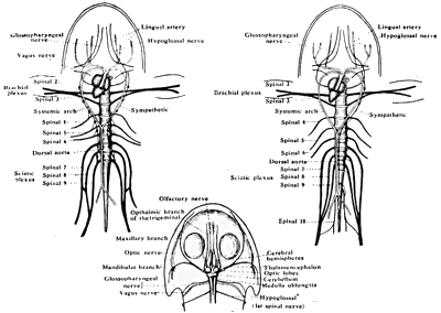 (d) The glossopharyngeal and the vagus (or pneumogastric) nerves, leaving the skull together, immediately behind the auditory capsule. The glossopharyngeal passes along in front of the hypoglossal nerve and proceeds along the base of the tongue. The vagus, after giving off branches to the dorsal muscles, reaches the walls of the pharynx and run obliquely backwards to supply the pharynx, heart, lungs and stomach.