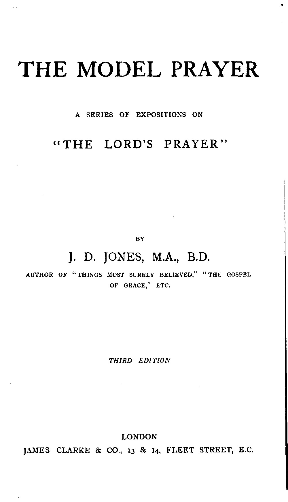 The Expositions in this volume were originally given as Sunday morning lectures. They are printed in deference to the wishes of members of my congregation, who, finding them helpful when first delivered, desire to possess them in more permanent form. They do not lay claim to any originality. I have derived help from many quarters, especially from the expositions of the Lord’s Prayer written by Dr. Dods and Dr. Stanford respectively. My thanks are also due to my friend Mr. E. Carr for many valuable suggestions, and for kindly undertaking to see this little volume through the press.