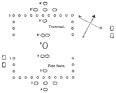 Mr. Jan Wessels of Harrismith was appointed as guide, and the force began to move as soon as it got dark. This was my first experience of about a hundred night marches in which I took part during the war, and I must confess that it was one of the worst I was ever in. I learned to know the Africander in one of his weak points—his impatience of discipline. I saw how he rebelled against what was the legitimate authority under which he should have submitted.—How different it became later in the war! As I write now nearly three years have passed since that night march, and if I compare it with the night trek, for instance, of the 23rd of February 1902 (of which I shall give an account later), it is well-nigh impossible to believe that the strong, obedient (p. 18) burgher of 1902 is the same man as the almost unbridled one of the end of 1899.