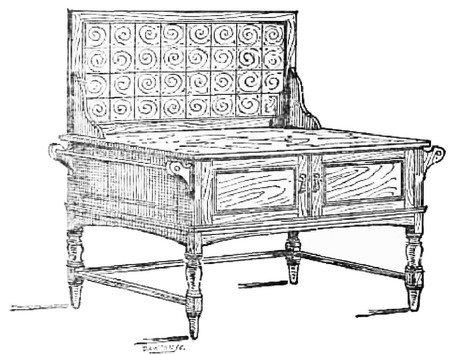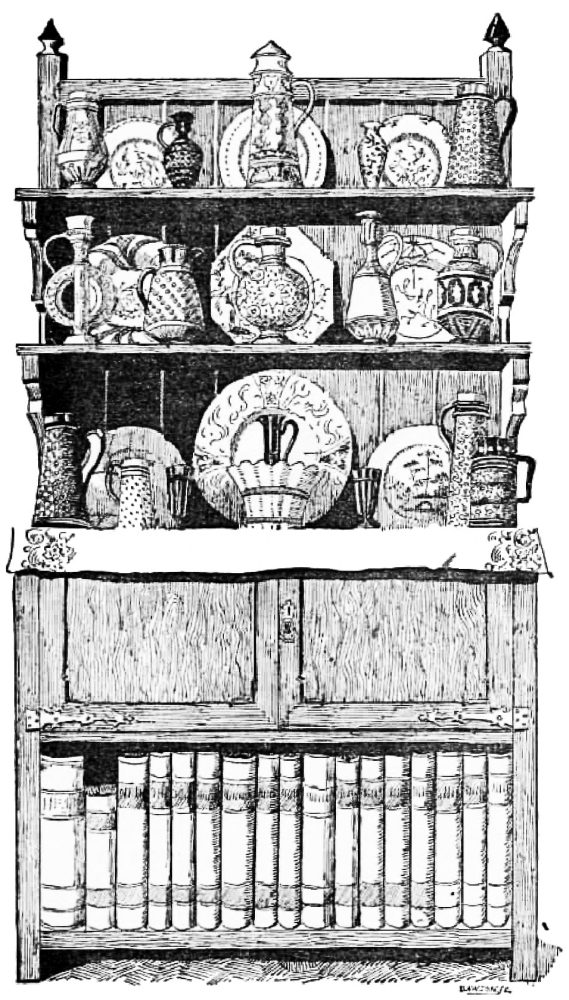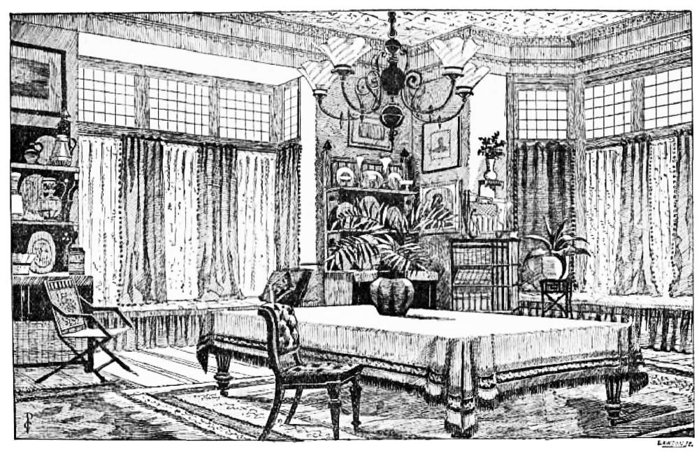 Do you recollect, I wonder, the orthodox dining-rooms of{8} twenty-five years ago?—the heavy, thick curtains of red or green cloth or moreen damask; the tremendous mahogany sideboard, generally with a cellarette underneath it, which, I recollect, made an admirable tomb in which to bury one’s dolls or obnoxious books, generally triumphantly taken from the schoolroom; the chairs that required two people to lift them; the carpet that seemed immovable, and that was too heavy to be shaken more than once a year; and the woolly-bear hearthrug that always smelt of dust, and that was a receptacle for all sorts of cinders, toy-bricks, leaden soldiers, and bones dragged in and buried there by a delinquent dog or cat? Why, the mere shaking of that rug once a week resulted in the discovery of all sorts of treasures that had been lost, and the dust that came out was enough to choke the neighbourhood, and doubtless would have done so had the other inhabitants not all been engaged with their own. Ah! if you do not all of you remember the dining-room of the past, I do; but never without a shudder, or a wonder how we managed to live in such a dark and dusty atmosphere, where work, reading, drawing, and writing all had to be hustled out of sight and out of the way of the parlour-maid, who came to ‘lay the cloth,’ and renew the foul odours, which had only just been exorcised, which breakfast had left behind it to poison the morning with. I should think that domestic furniture was at its very lowest depths of despair then; but that is thirty years ago, or perhaps forty, and nothing turned the tide for quite twenty years!