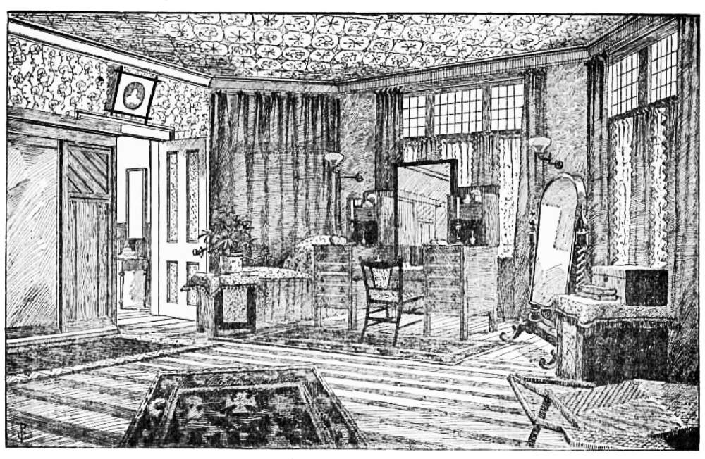 Doubtless the great thing that strikes us when we are house-hunting is that if women architects could get employment houses would be far better planned than they are now. In each bedroom, it seems to me, that I have inspected—and their name is legion—the male mind that designed the rooms never took into consideration that a bed should not stand between the windows and the door; which, by the way, is always put so that the moment it opens the occupant of the bed has a full view of the passage or landing; he has given us no recesses in which we can put shelves, and by a judicious curtain arrangement do away with the necessity of buying large and expensive wardrobes; he puts the fireplaces where, if we are ill, we could not possibly enjoy ourselves with sitting over the fire and warming ourselves; and he gives us far too many windows as a rule, and almost ruins us in blinds and curtains, to prevent the neighbours from gazing at us when we are dressing.