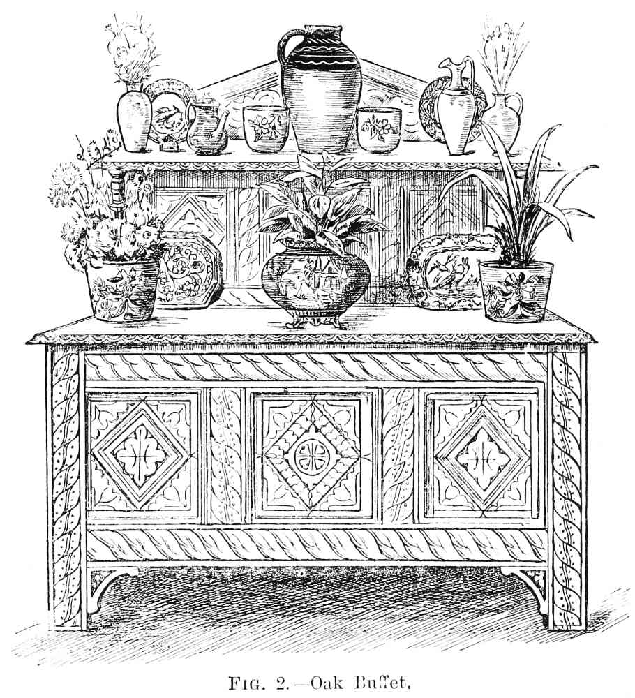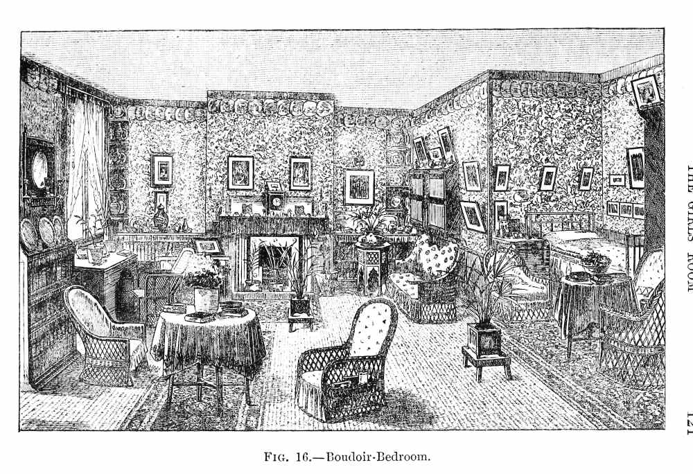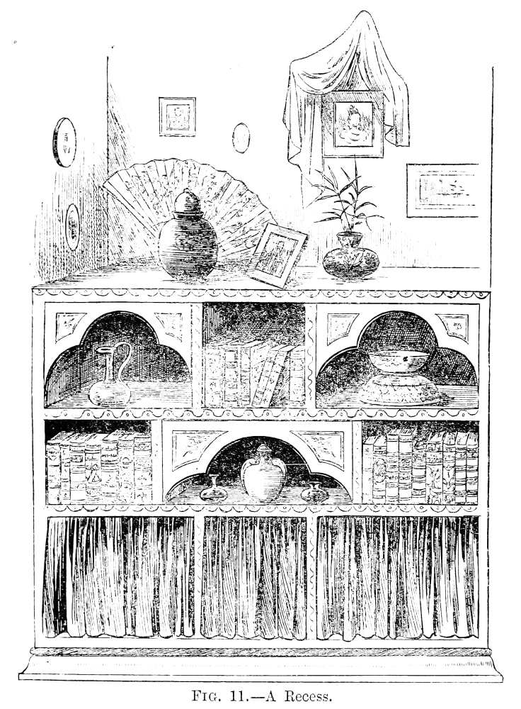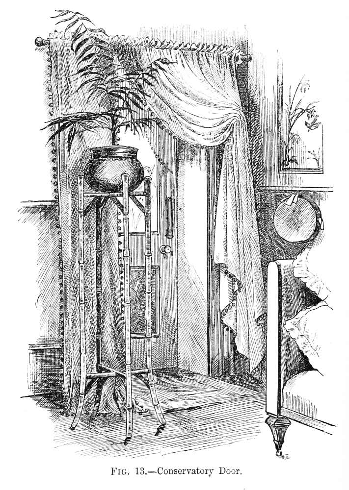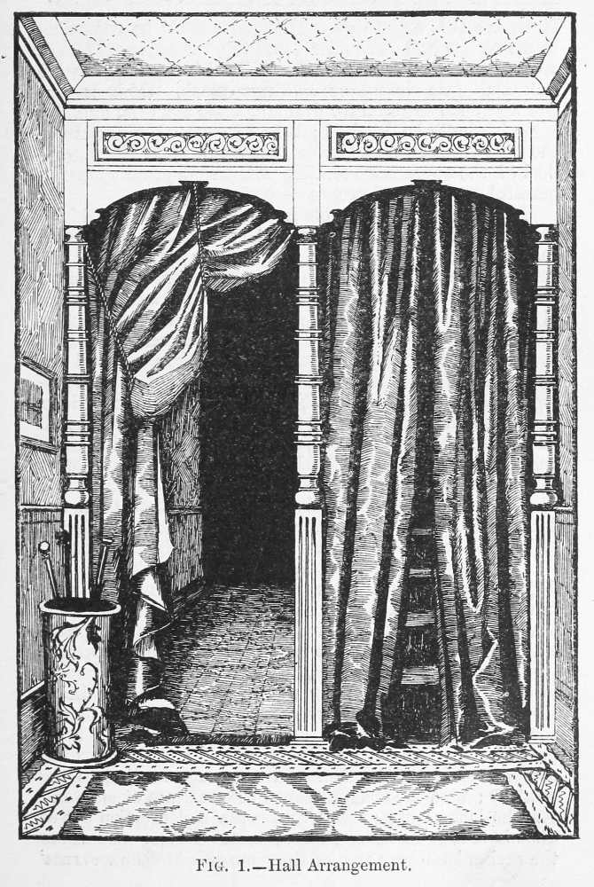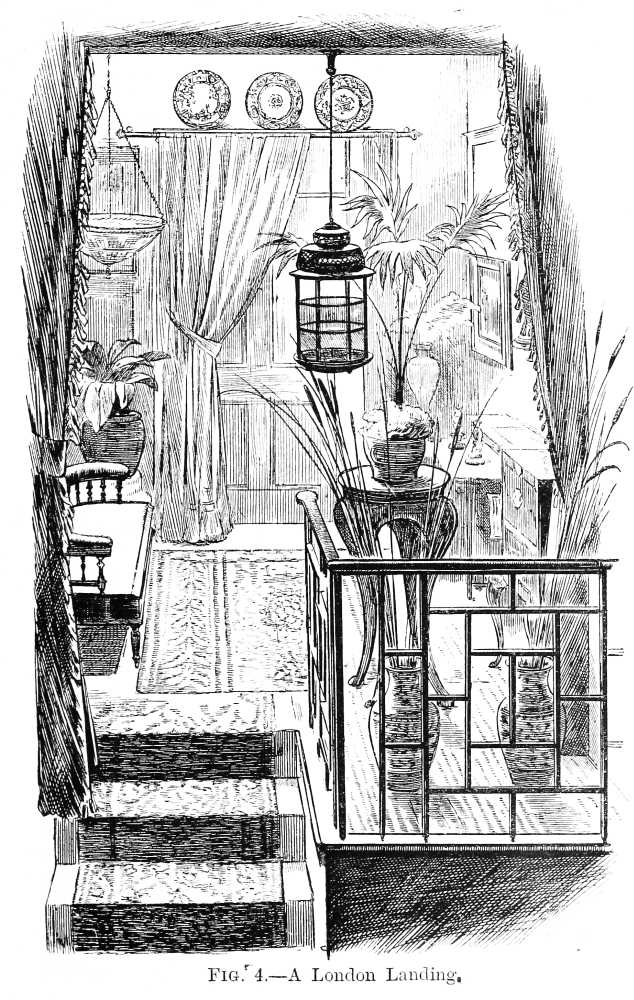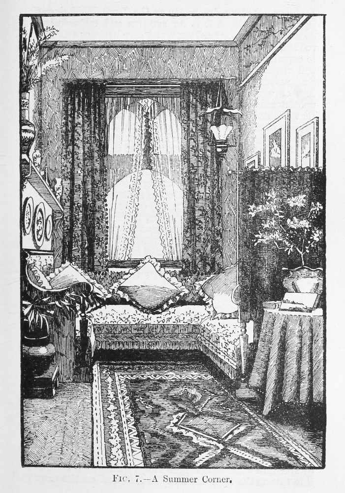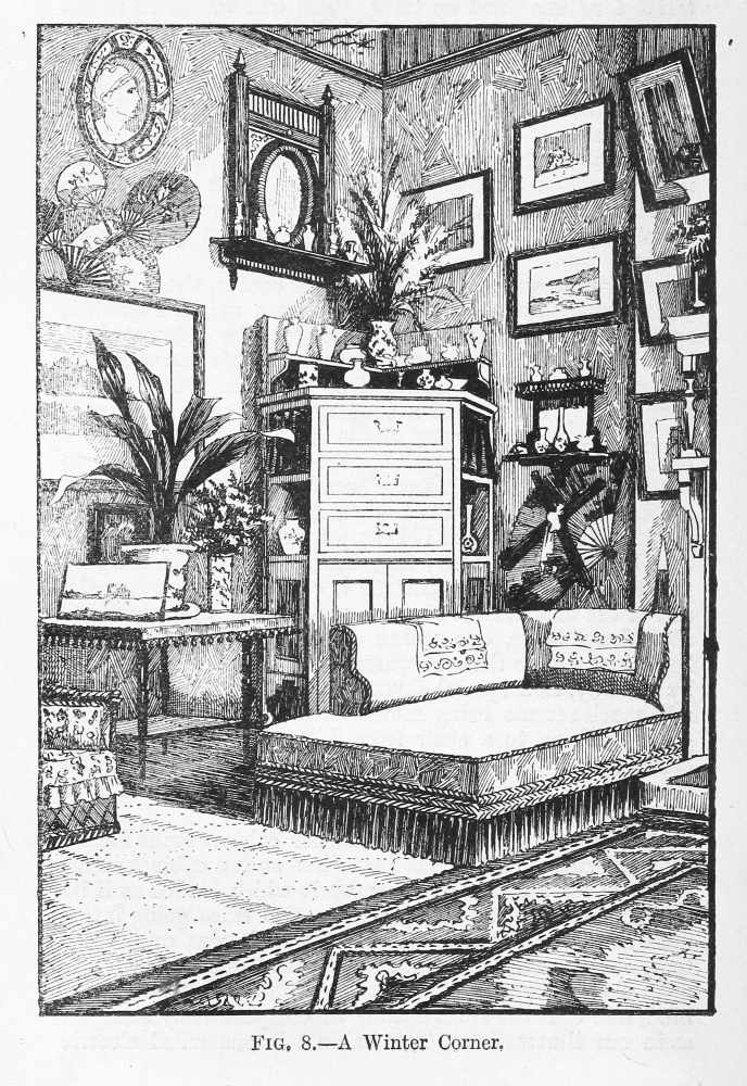 Formerly people rather scorned the idea of being ‘house-proud’ in the same manner in which all are nowadays. Their house-pride was merely expressed in the amount of gilding compressed into a single room; in the thickness of their carpets, the heaviness of their draperies, and the general costliness of the plenishing, and the amount of money these things had cost was far more often spoken of than anything else; while the name of the upholsterer was mentioned, not as a guarantee that taste and skill had been called into action, but as a proof that money in this case had not been an object. Formerly, did I say? Alas! cases still exist of this heavy and depressing style of thing! Money is poured out like water on carpets that are nightmares, and on papers that are as absolutely meaningless as they are ugly, and the despair of anyone who is called in, as I am constantly, to mitigate the horrors of some gigantic monument of bad taste and lavish expenditure.