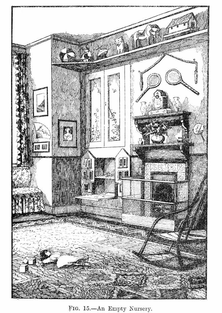 Then comes the question of the house. This should be large enough to take all the family and allow for any possible additions; but at the same time Angelina will have to remember that when the boys are at school there will always be a room for a friend, and therefore the question of spare rooms is not such a vital one as it was. She will also have to legislate for the girls’ own room—probably a room for a governess, though a resident governess should be avoided unless the house is a good size, and unless she is an absolute necessity. There is the schoolroom to think of, and she must contemplate—perhaps ruefully—the nurseries, with an eye to adapting them to another purpose, when that saddest of all days comes when we cannot deceive ourselves{12} into believing a nursery is any longer necessary, and we have to turn our backs on our youth and the dear small child-inhabitants at the same time. A house without a nursery is never as joyous or lively as one that possesses such a room, and it’s no use trying to believe this to be the case. Still it is equally of no use to set apart the best room in the house for that most pleasant of all chambers, if there is no chance of nursery children, and if all are merged into the young gentlemen and ladies, who are fast growing up and eagerly longing to launch their boats on the sea of life for a cruise of their own.