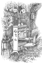 Of course, if we are in the heavenly position of having no old furniture, and can set to work with a free hand, and sufficient money to enjoy ourselves, we can at once do just as we like. But no! even then we have to consider the special room and how best to circumvent its idiosyncrasies. As a rule the door is on the same side as the fire-place, or else exactly opposite it, and we may have recesses on each side of the fire-place, or we may have only an expanse of straight wall beyond the door, and not a recess in the whole place. This latter is the worse fate of the two. The recesses can always be filled either with the charming buffets made both by Smee & Cobay, and Wallace, or by colourable copies of the same without backs, made to fit the recesses, which I do not advise, save in cases where money is a great object: then and then only such an arrangement could be allowed. The shelves could be on brackets and the wall behind hidden by little sateen curtains, sateen curtains replacing the doors in the cupboard part. These shelves could{120}
