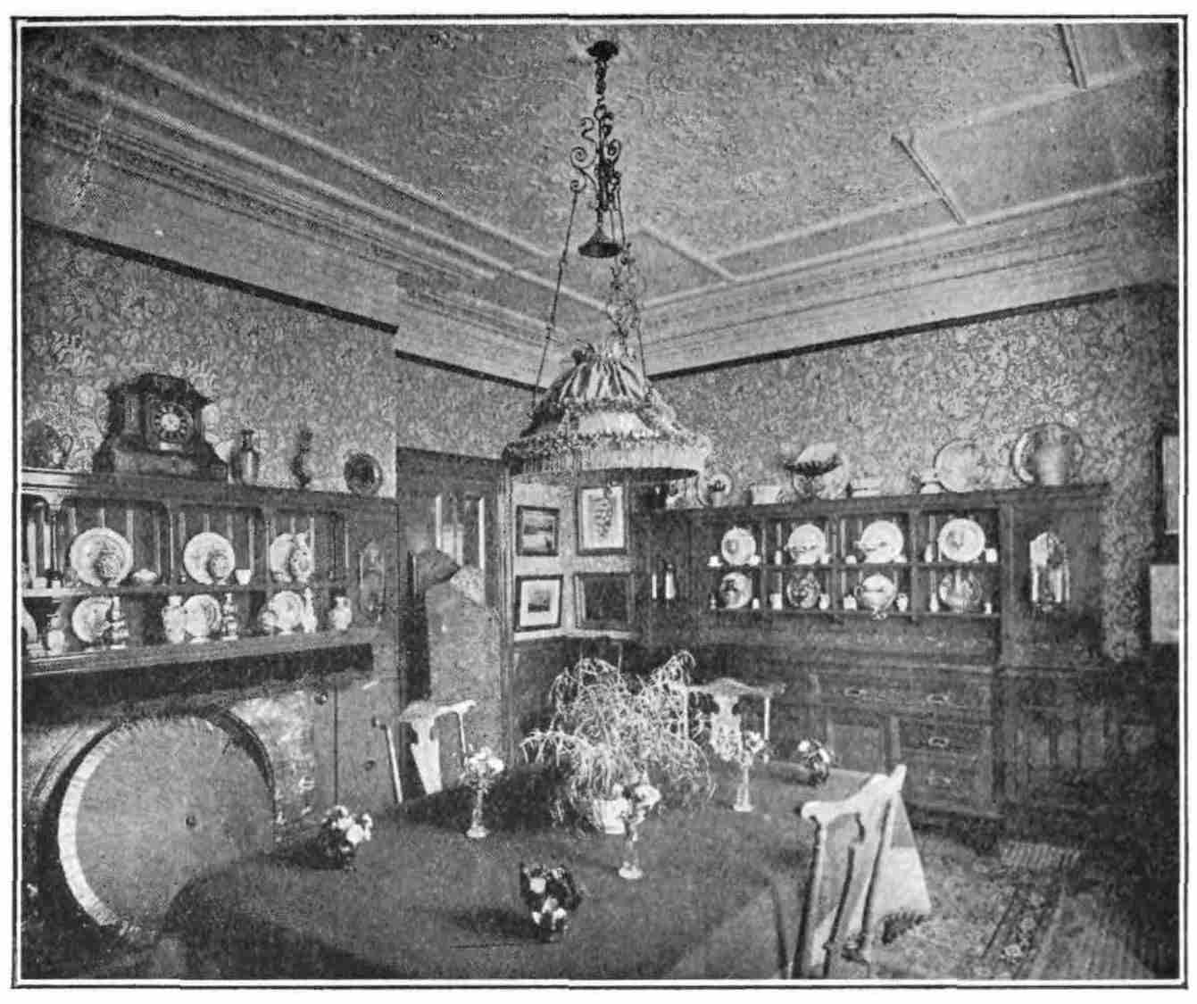 The first room I ever approached with an eye to decoration appeared to be everything it ought to be, and seemed simply perfect. It was large and lofty, had two wide and beautiful windows, and a good, deep fireplace and an excellent floor; but alas! I was not as wise then as I am now, for my only acquaintance with houses was confined to two family houses, in which I had lived all my life, and which were properly built, whatever their other faults might have been: and, in consequence, my sufferings during the first month in that special dining-room were so acute that I have never forgotten one of the numerous pangs and torments I endured: silently, it is true, because then I thought them inevitable, and it is never any use grumbling against things which must be borne! But presently sense awoke in my brain, and I saw that nothing which had caused me such woe need be put up with any longer, and I verily believe the knowledge I{96} have since developed on the score of house-furnishing and decoration first became mine in that special house, for I was roused to the fight with cold and discomfort inseparable from a quiescent residence in a suburban house, and soon discovered cold could be expelled did one rise to the occasion and determine that, somehow or other, one would conquer, and no longer play the ignoramus or the very painful rôle of the conquered.
