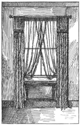 Now one word about the curtains which may possibly have to be used, which may be artistic and pretty, and yet may not quite fit the{118} bow windows. If they are too long and wide anyone can tackle them; if they are too short it is easy to make them longer by adding as much holland at the top as is required, and then covering that with an adaptation of Mr Ernest Newton’s turned-over draperies. If the original curtain is a plain material, as, indeed, all curtains should be, the holland should be covered by a deep flounce edged with trellis fringe, of some figured material, either a good tapestry or my pet printed velveteen. If the curtain be figured the turn-over drapery should be in plain Bokhara plush or velveteen, while cheap serge curtains can be lengthened by merely joining on more serge at the top, and hiding the join with a narrow piece of ball-fringe merely tacked on. If the curtains are too narrow, they can be widened with a deep flounce or frill of soft Surah silk, or even sateen, in some plain colour, but these devices should only be resorted to if the curtains are really worth saving; if not, it is far better in every way to sell them, or give them away—the ever-ravenous Kilburn establishment is always open to such gifts—and purchase others, which can not{119} only fit the windows, but at once allow us to have, perhaps, far more harmonious surroundings.