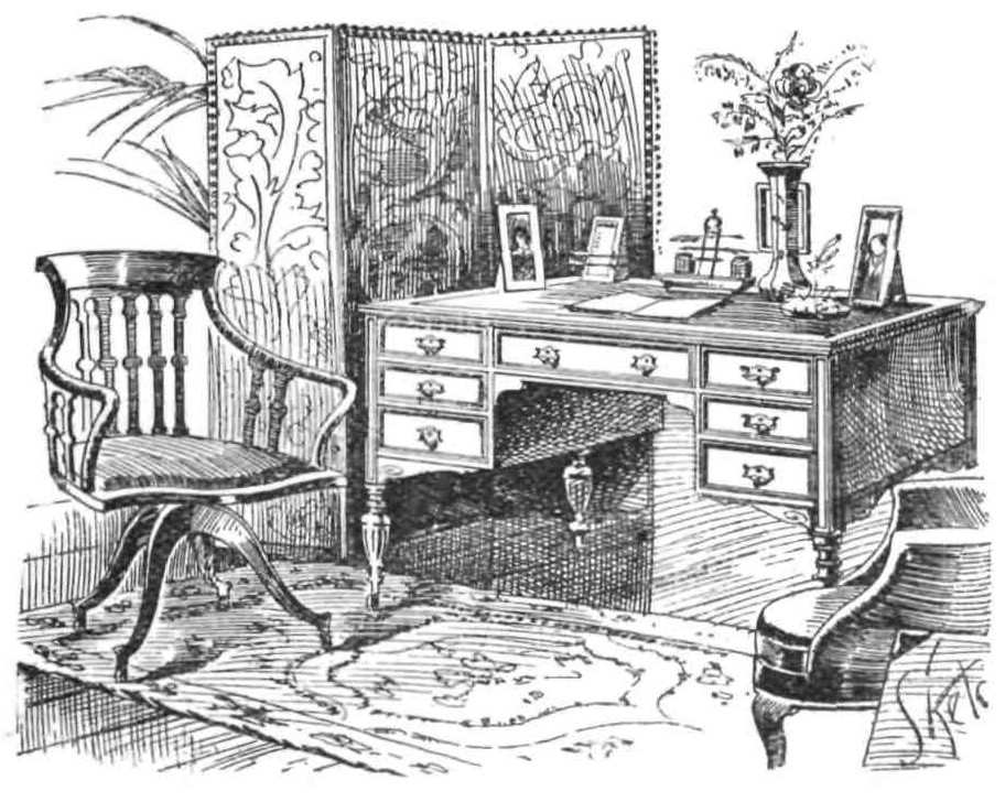 deal with, and these, unless we are much overlooked, should have one set of stout material curtains only. As a rule these windows are{116} divided into two parts, the top filled in with stained glass and immovable, the second plain glass and opening either straight out or straight into the room. The rods for the material curtains should come below the stained glass, and each curtain should be placed to go down the wooden part of the window frame only, and each small curtain should be drawn to keep out the sun as required. If muslin must be had in addition to the material, it must, should the window open out or into the room, be fluted on a couple of rods, which are placed top and bottom of the window itself. But if the window open outwards frilled muslin curtains can be arranged on rods on the window frames, to remain in place whether the window is open or shut, an arrangement which is imperative should neighbours be close, or at anyrate, if we are provided with ‘Caldecott’ windows in our bedrooms. I do not advise a window-seat unless we have two windows, because no one should ever sit in the dining-room unless it is positively necessary to do so, and, moreover, it is well to use the space for a writing-table and chair in any but a really large{117} house, and that is a place about which I am not writing at this moment. Here can the husband devote some of his time to household matters and letters of friendship when he is at home, while if there is no third room the mistress can use the desk in the day-time, albeit I trust she may have her own in the drawing-room, that is, if she cannot utilise some upstairs room, although under no circumstances can I advise the stuffy and stupid muddle of so-called ‘boudoir bedroom.’