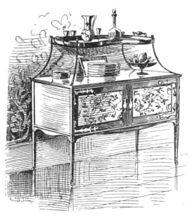 green material with copper hinges and fixtures, but with no looking-glass about it anywhere, and with nooks and odd places generally for china and odds-and-ends. Then on one side of the fireplace should be the dinner wagon, as illustrated, made from my ideas by Wallace. The wood can be stained green, and the tray is copper. This is removable, and allows the maid to carry out plates, china, etc. without an effort, thus very greatly simplifying the mysteries known as ‘clearing away.’ There should be about ten chairs in the ordinary dining-room and these{122} could have stained green frames, and either orange or bright red leather seats. In this case the wall-paper should be real sealing-wax red and cream over a stained green dado, or else real bright orange over the same kind of base to the wall. If money is a great object the seats can be rush, but leather should be managed if possible, and the real orange or bright red are as novel as they are artistic and beautiful with the green furniture. A soft green carpet with very little pattern on, should be chosen, and soft green curtains. The other colour selected should be introduced at the top of the curtain in the turned-over top, which should be of printed velveteen; and if the rush-seated chairs are used, a couple of arm-chairs for the master and mistress should be procured. If there be no third room, leather arm-chairs must be bought and placed one each side of the fire; for here, alas! the husband must smoke if he indulges in that detestable habit, for unless there is a tiny conservatory, and there often is fortunately, even in quite small suburban houses, he will have no other place. But given the conservatory he can{123} smoke there. It can always be made warm and pretty, and his smoking will be good for the plants, and that at anyrate will be some small consolation to him.