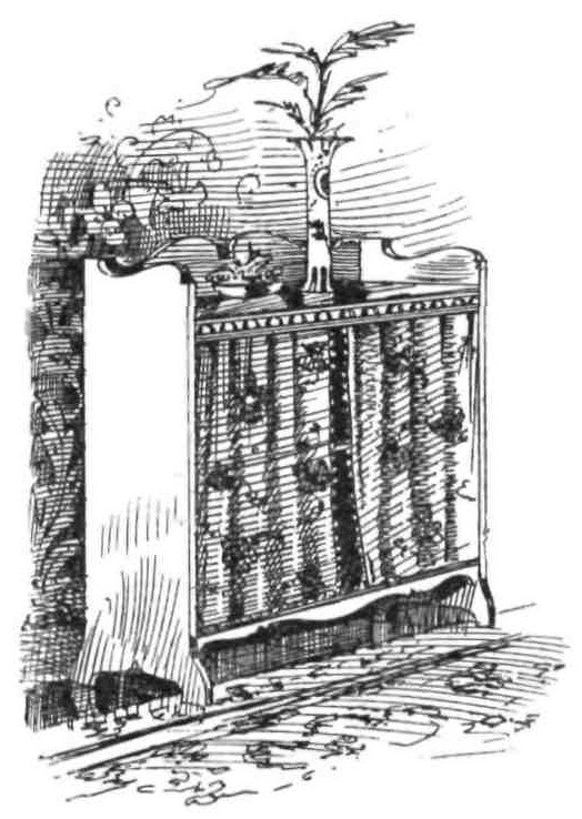 If we wish to make a complete conquest of the special suburban residence we are about to circumvent, there is no doubt whatever that the first battle of all has to be fought and won on the very doorstep. Nay sometimes one has to commence the conflict before we reach as far as that, for have we not the ‘carriage sweep’ to tackle and the slamming gate to minister to before reaching the front door? If we are cursed with the ‘approach,’ all we can do is to make the gate as inoffensive as we can, for alas! we must keep it or we shall have our front garden a gathering ground for all the curs in the neighbourhood. But we must e’en remove the latch altogether, and line the place where it was with indiarubber, and put a couple of stout indiarubber springs on the house side of the gate, which should have an inner{32} lining of wire-netting, and a head-trimming of barbed wire, or else of rough nails, to prevent the demon boy seating himself thereon. Then, if by firm refusals to allow tramps to come up, and by never giving them one farthing—or indeed anything save a bread ticket redeemable at the nearest baker’s shop, and which, ten to one, we shall find torn up in our ‘avenue,’—we can induce them to mark our gate with some secret sign, which means we are unspeakable brutes and not good even for a ‘little hot water,’ we shall have ensured ourselves a certain amount of quiet, and shall, at all events, have begun our campaign in the right way. Our gate we should paint some good solid colour, and Indian red is a good shade with green hedges and trees about us, as is also a special shade of dark olive green. Then the name of the house should be painted on in white, not gilded letters, and if we put as well ‘Please shut this gate quietly’ on both sides of the top bar, we shall find that we at least are no longer noise-makers in general, and, as far as our special gate is concerned, the great slamming question is replied to satisfactorily.{33}