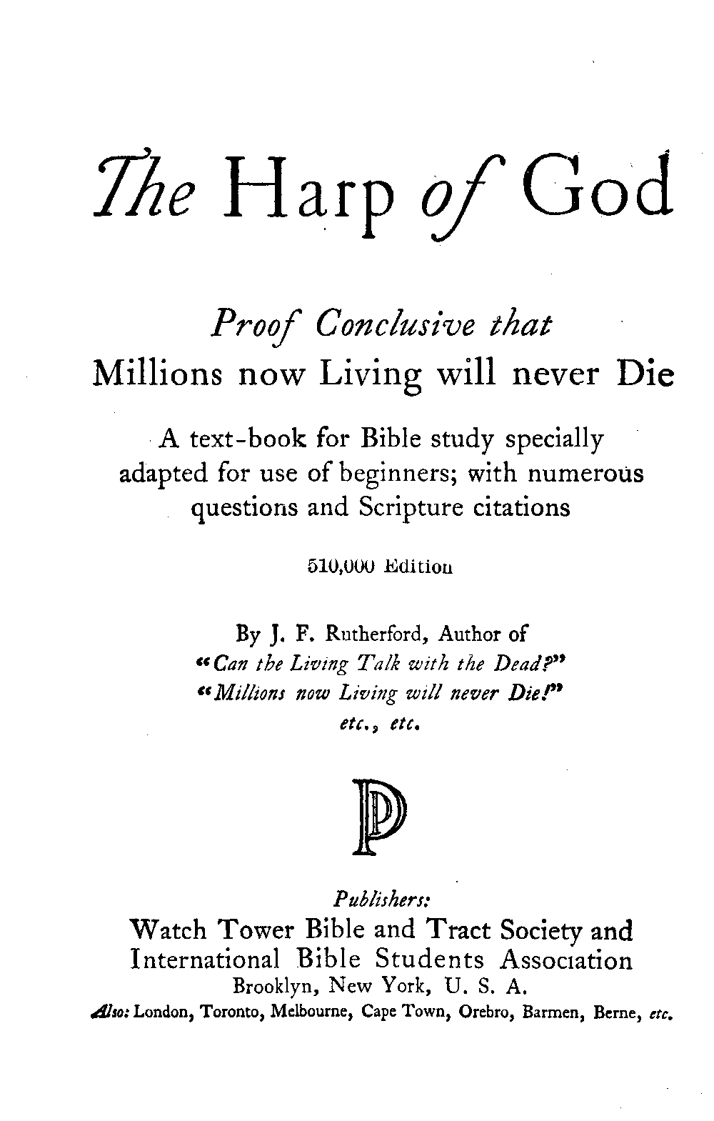The harp is an instrument which, when used by a skilled performer, brings happiness and cheer to those who listen. The harp of God, when understood and skillfully used, brings peace of mind and gladness of heart. The title of this book suggests the thought of good cheer and happiness. The message herein contained, taken from the Word of God, is sent forth with the prayer that it may be a blessing to many, that it may cheer some who are sad, bind up some broken hearts, comfort some that mourn, and give all who earnestly read a deeper appreciation of Jehovah and the Savior of mankind.